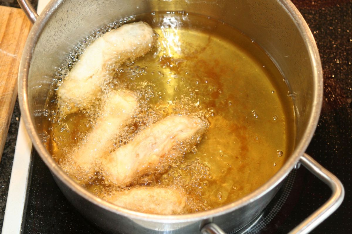Die fertigen Rollen werden jetzt in heißem Öl oder Palmin ausgebacken, geht sehr schnell.