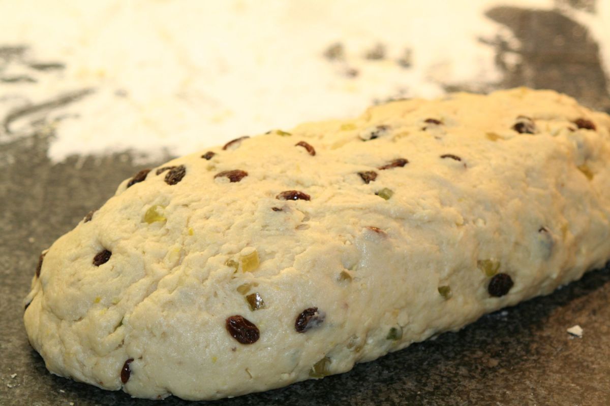 „Ich halte es für besser, den Teig erst ohne Mandeln, Zitronat, Sultaninen usw. gehen zu lassen und die Zutaten erst vor dem auf’s Blech legen unterzukneten.“
