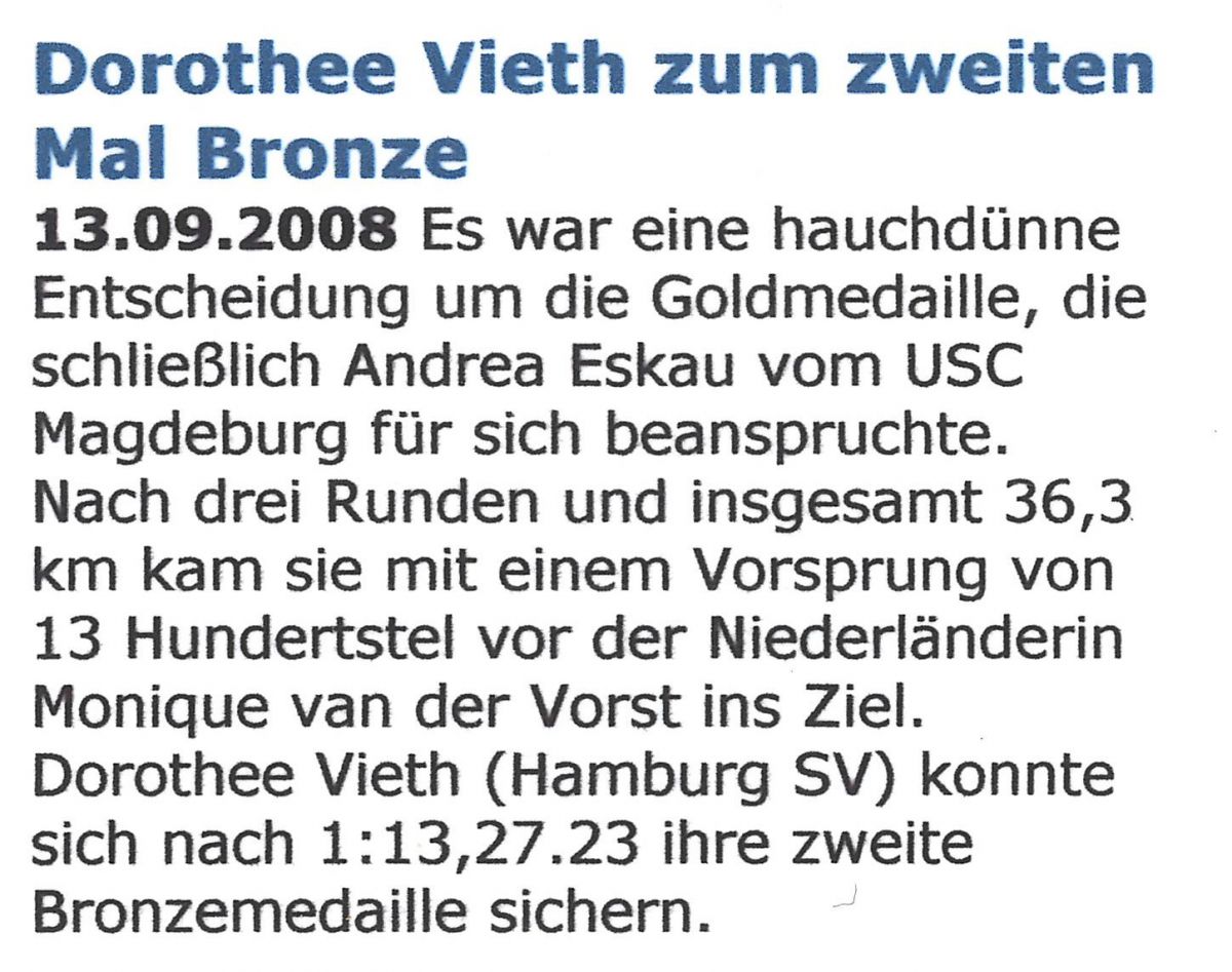 13.09.2008 Es war eine hauchdünne Entscheidung um die Goldmedaille, die schließlich Andrea Eskau vom USC Magdeburg für sich beanspruchte. Nach drei Runden und insgesamt 36,3 km kam sie mit einem Vorsprung von 13 Hundertstel vor der Niederländerin Monique van der Vorst ins Ziel. Dorothee Vieth (Hamburg SV) konnte sich nach 1:13,27.23 ihre zweite Bronzemedaille sichern.