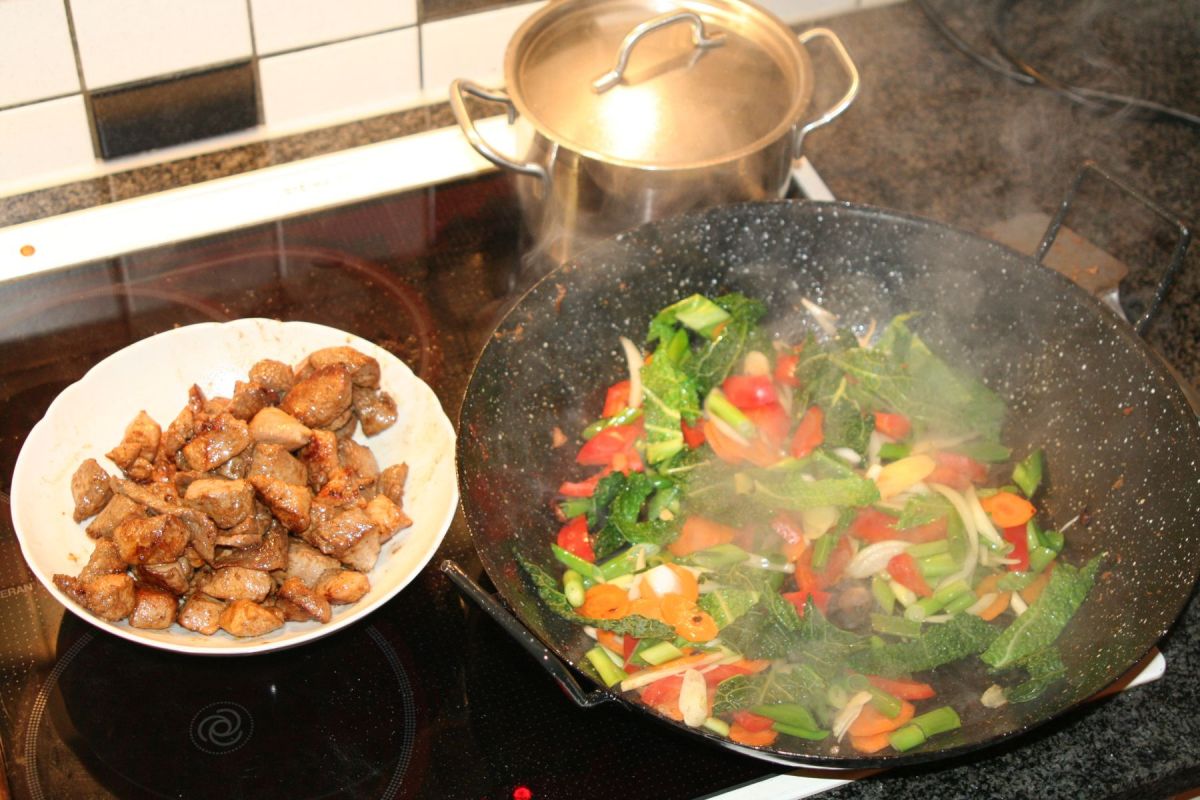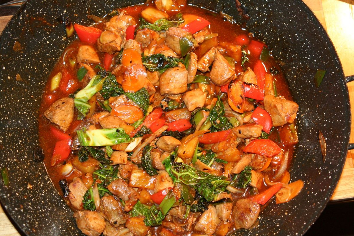 300-400g Fleisch schier (Schwein, Rind, Huhn), 2-4 EL Sojasoße, 3 EL Sakewein (Reis-), Salz, 5-Gewürze-Pulver (Anis 80%, Fenchel, Zimt 6%,Pfeffer, Nelken) oder doch lieber einfach Chinagewürz? Glutamat?!, 1-2 rote Paprikaschoten, 1 Bund Lauchzwiebeln, 1 Möhre etwas Ingwer und Knoblauch, 150g Ananasstücke (Dose), 3 EL Öl, wir hatten gerade noch ein Wirsingblatt über – zack, mit rein.