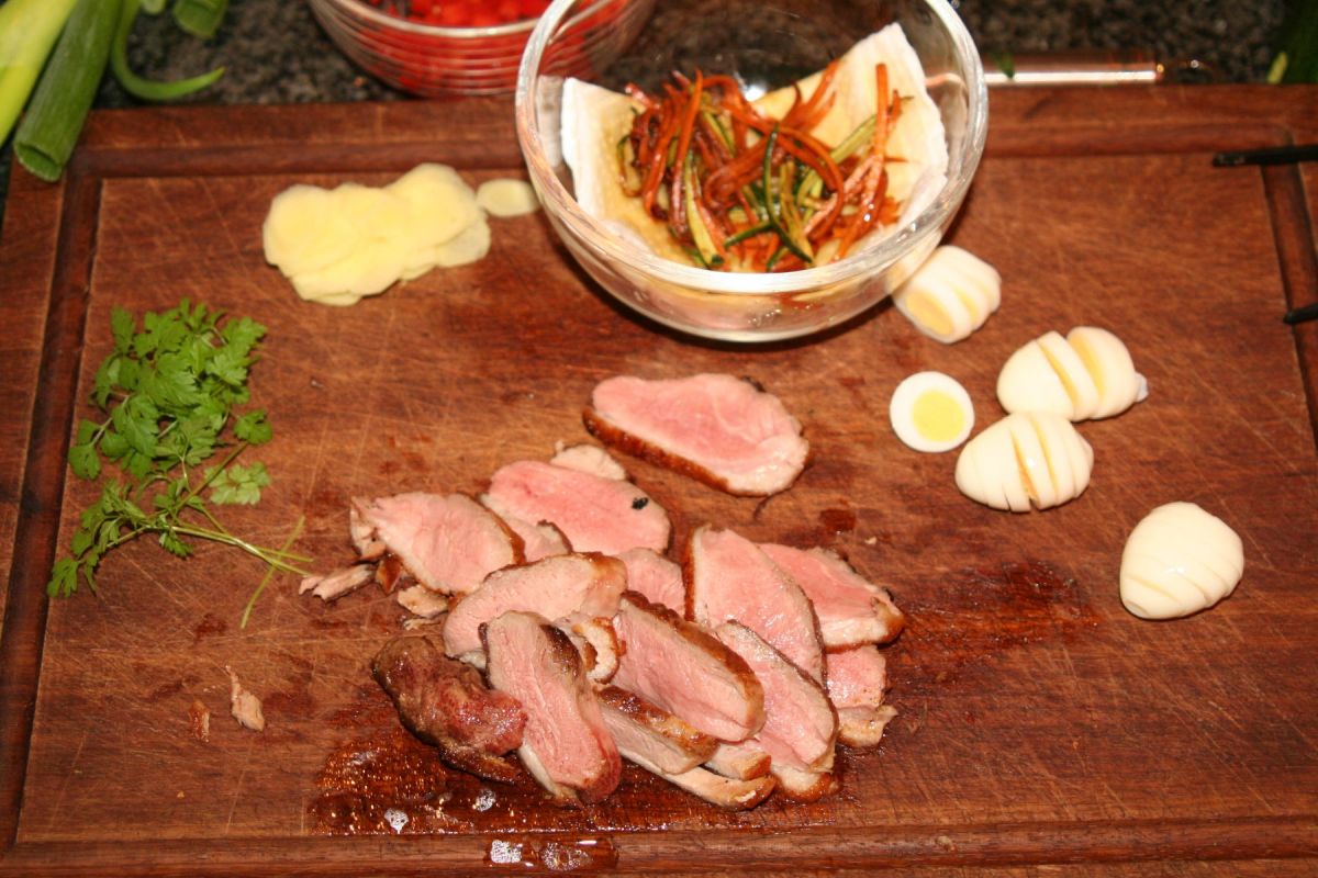 Zesten von Zucchini, Karotte und Paprika getrennt oder zusammen anschließend z.B. in Entenfett braten – dazu müssen natürlich erst einmal die Entenbrust und auch das Lammfilet rosa angebraten werden.
