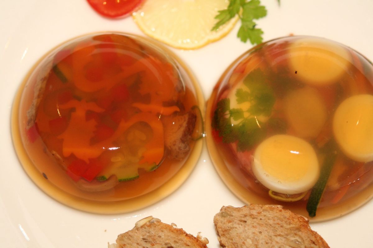 Auch hier sind natürlich alle Variationen erlaubt. Sei es in der Wahl der Kräuter, des Fleisches oder der feinen Gemüse. Gut aussehen muss es und fein sein und Fond ist praktisch, weil er klar und fettfrei ist und einen intensiven Grundgeschmack liefert.