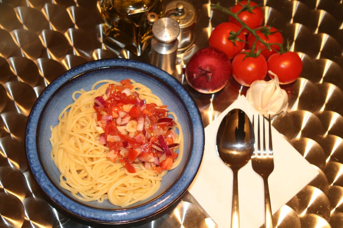 Tomaten in kleine Stücke schneiden, dazu viel Knoblauch pressen, Zwiebeln fein würfeln, Salz, Pfeffer und Olivenöl. Kalt serviert und dazu heiße Spaghetti satt.