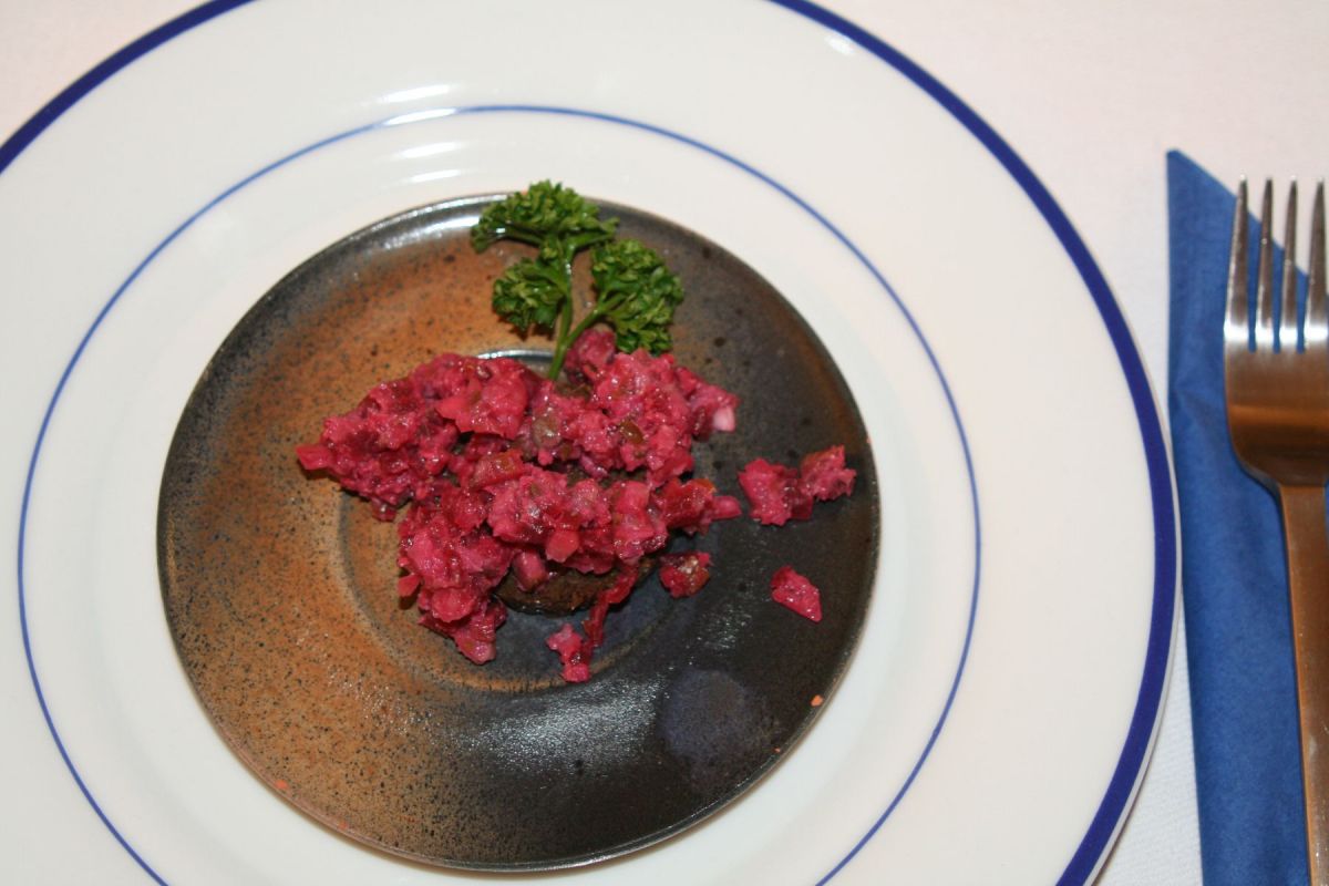 Christianes polnischer Kaviar wird gehackt und gemixt aus … und dann auf einem in Butter gebratenen runden Schwarzbrot-Ausstich serviert: