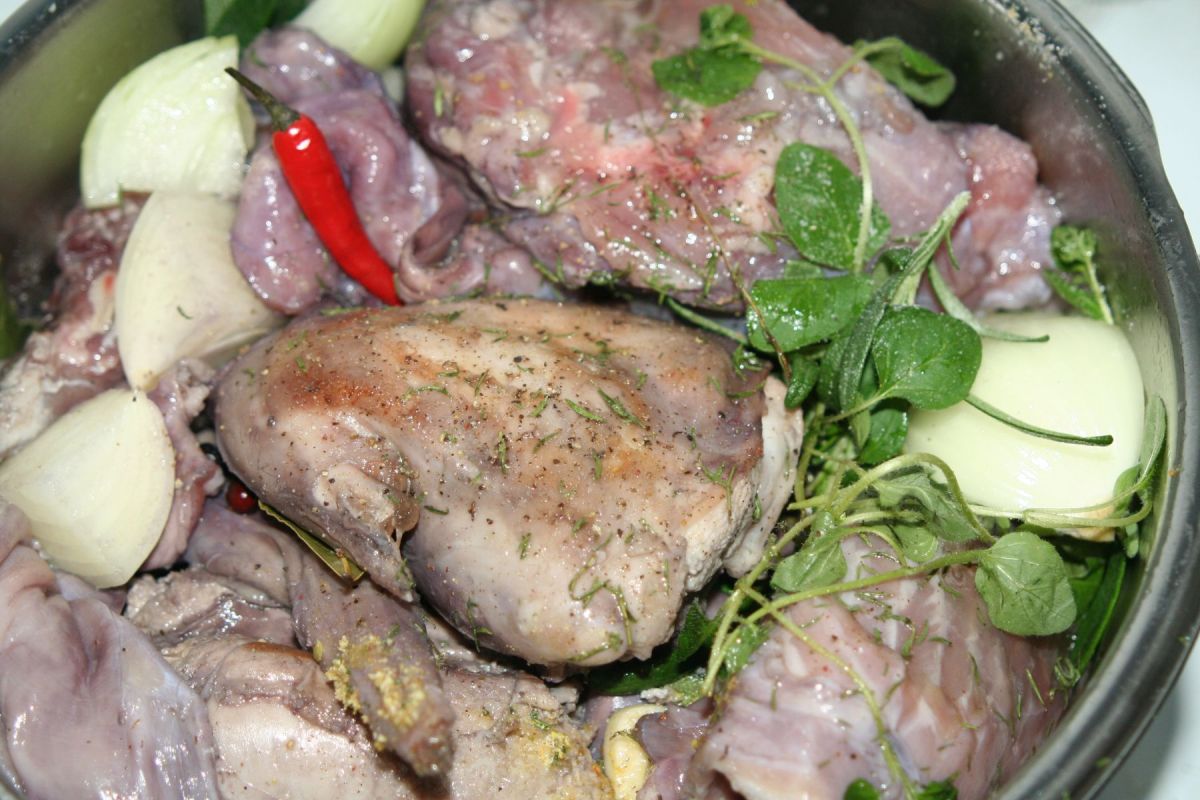 Mit der Geflügelschere lassen sich handliche Stücke teilen. Im Topf kurz und scharf anbraten, dann die Stücke mit frischen Kräutern wie Thymian, Basilikum und Rosmarin, 10 Wachholderbeeren und ein paar Lorbeerblättern zusammen mit geachtelten Zwiebeln und zwei zerstückelten Knoblauchzehen in den Schnellkochtopf geschichten. Etwas Instant-Brühe dazu und ein Glas Wasser, dann von dem Wein dazu, in dem die Kaninchen schwimmen gelernt haben. Den Schnellkochtopf halb mit Flüssigkeit auffüllen.