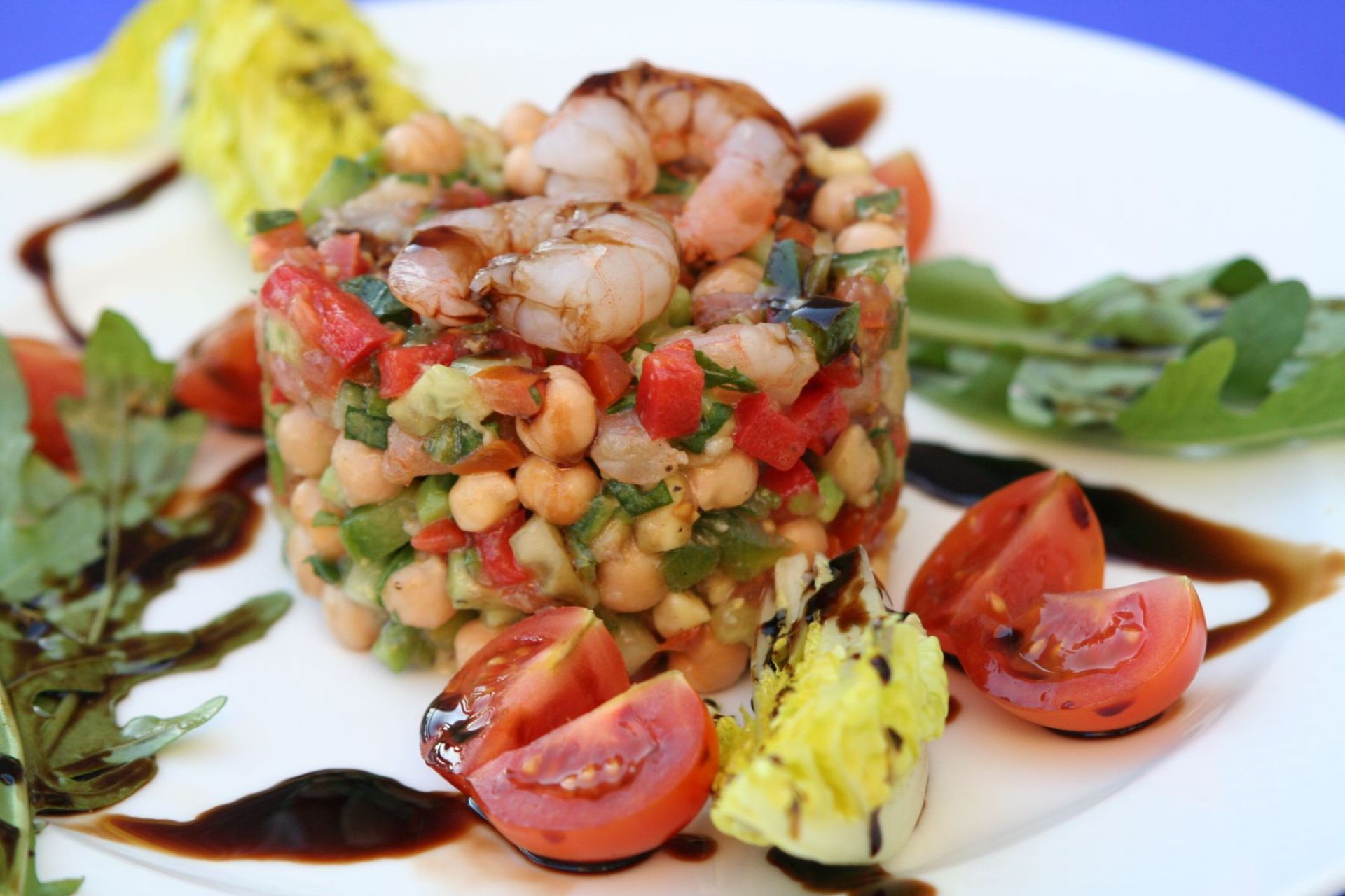 Paprika, Gurke und Tomaten in kleine Stücke schneiden – etwa so groß wie die Kichererbsen – vielleicht auch etwas Rucola? Alles in eine Schüssel geben, mit Salz, Pfeffer und Balsamico abschmecken. Dazu kommen die in einer Pfanne kurz gedünsteten Gambas: Für den Salat zerteilt - für die Deko Ganze aufheben. Der Salat wurde in Würfelform serviert, umlegt mit Tomatenachteln, Rucola-blättern und einem halbierten Salatherz (gute Idee, denn das Herz ist irgendwie immer störend im normalen Salat). Obendrauf 2 Shrimps und das Finish mit dem Balsamico-Balsam in Streifen über den ganzen Teller führen.