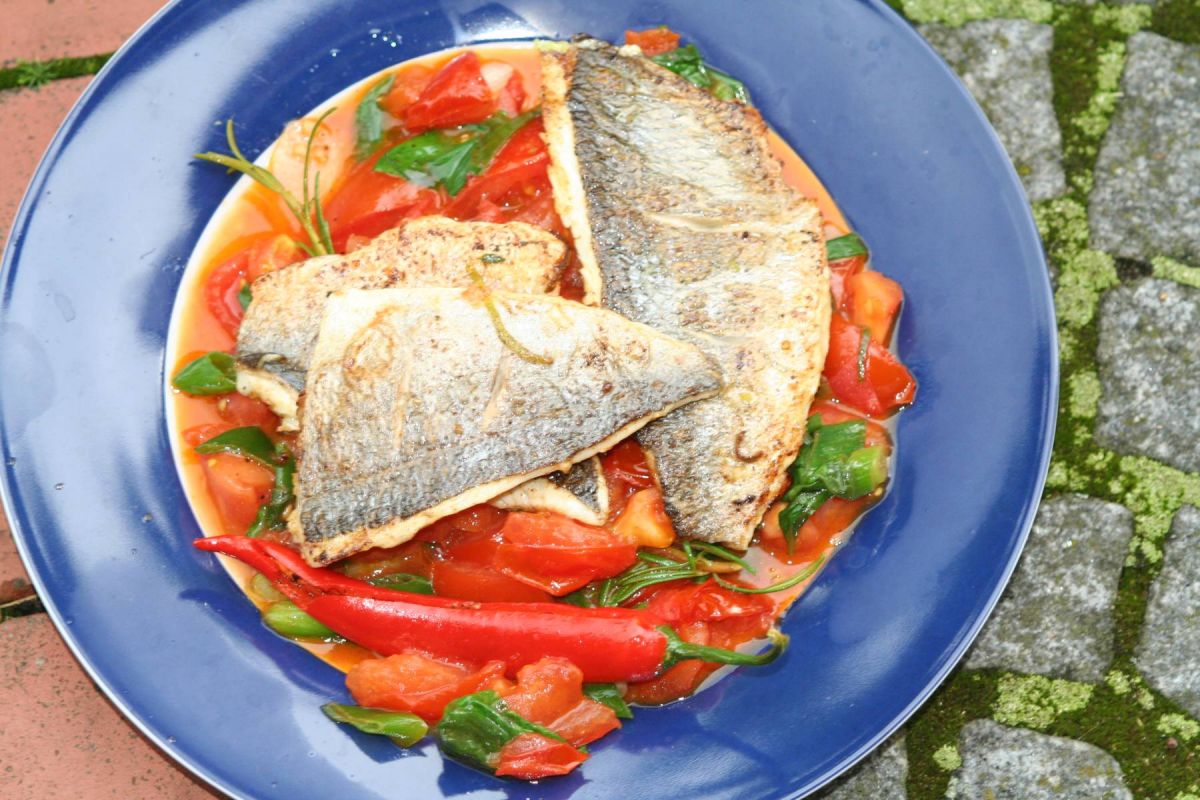 Für den lauwarmen Tomatensalat die Tomaten waschen und den Stielansatz entfernen, dann in mundgerechte Stücke schneiden. Schalotten und Knoblauch schälen und in Streifen scheiden. Die Chilischote nur etwas einritzen. Olivenöl in einer beschichteten Pfanne erhitzen. Tomaten, Schalotten, Knoblauch und Chilischote hineingeben, dann mit Salz und Zucker würzen. Alles maximal 2 Minuten braten, dabei immer wieder gut vermengen. Die Tomaten sollten ihre Form behalten und nicht zerfallen. Zum Schluss frische Basilikumblätter und den Himbeeressig hinzufügen und lauwarm mit den Doradenfilets servieren.