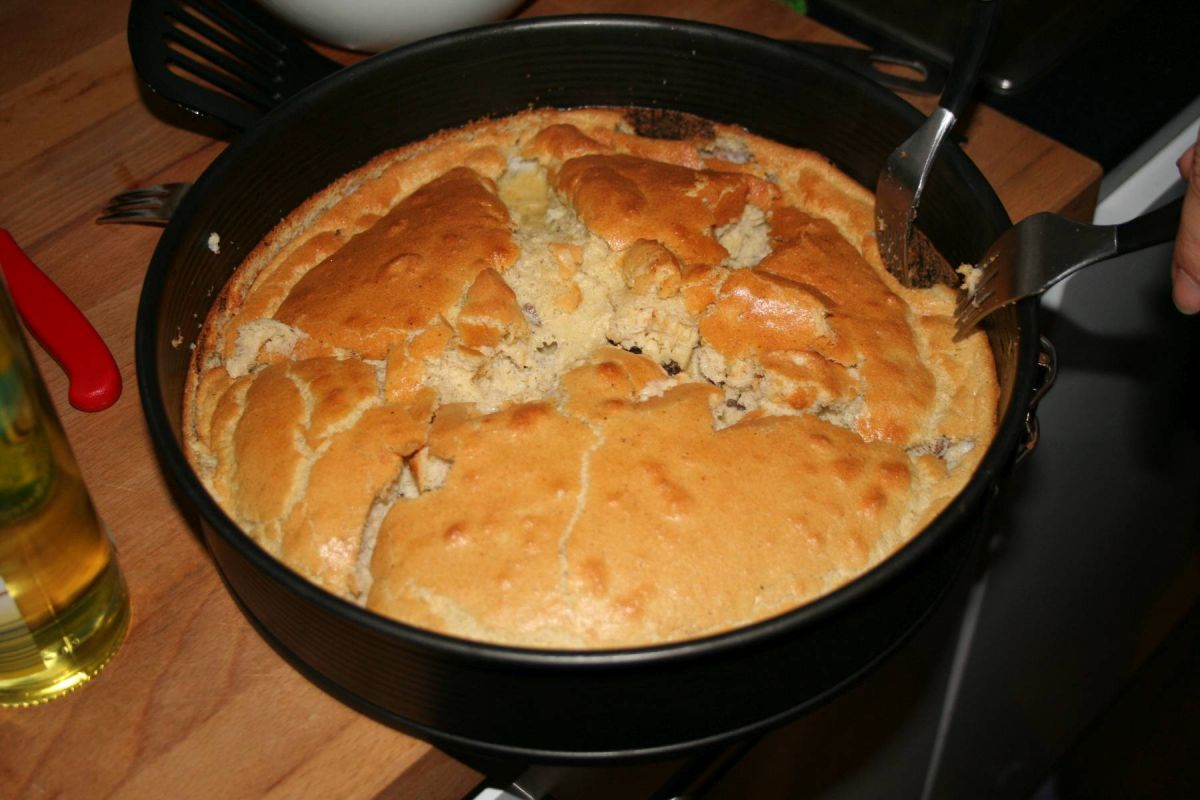 Die Hälfte der Butter in einer Pfanne erhitzen, die Hälfte des Teigs eingießen und auf der Unterseite anbräunen lassen, umdrehen, ebenfalls anbräunen (der Kern ist noch leicht flüssig), die Masse im vorgeheizten Backofen fünf Minuten ziehen lassen, herausnehmen und mit einer Gabel in kleine Stücke reißen. Mit der restlichen Butter und der Teigmasse ebenso verfahren.