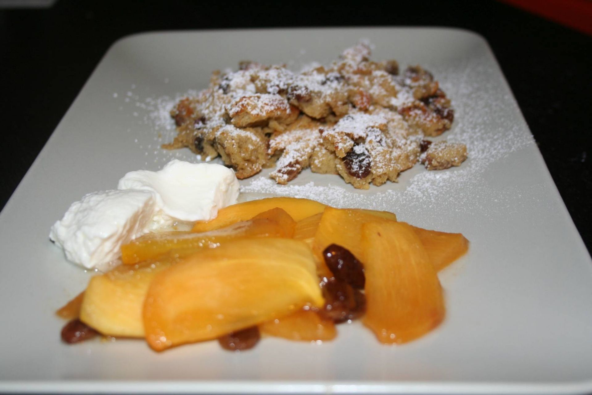 Für den Kaiserschmarrn die Eier trennen, Eigelb mit geklärter Butter, Mehl, dem Mark von einer Vanilleschote, dem Zucker und dem Vanillezucker, dem Abrieb von einer Zitrone, dem Lebkuchengewürz und der Sahne zu einem glatten Teig verrühren. Eiweiß zu Schnee schlagen und unter den Teig heben. Danach 2 EL Rosinen – vorher in Rum eingelegt – in den Teig geben. Backform mit Trennfett besprühen und den Teig hineingeben und im vorgewärmten Backofen bei 200°C für 5 Minuten backen. Danach mit einem Pfannenwender zerpflücken, etwas geklärte Butter darüber träufeln und für weitere 10–12 Minuten in den Ofen schieben.