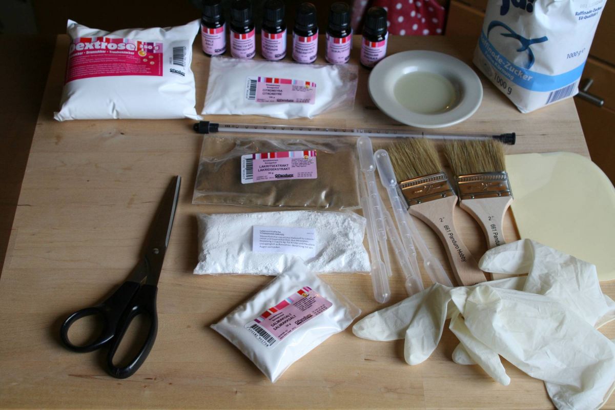 Also wird neben den geschmacksorientierten Chemikalien ein spezielles Thermometer gebraucht. Dazu zwei Teigschaber, Pipetten, eine Teflonunterlage, Brandsalbe und Aufbewahrungsbehälter, dazu eine große Schere und eine Waage und und und