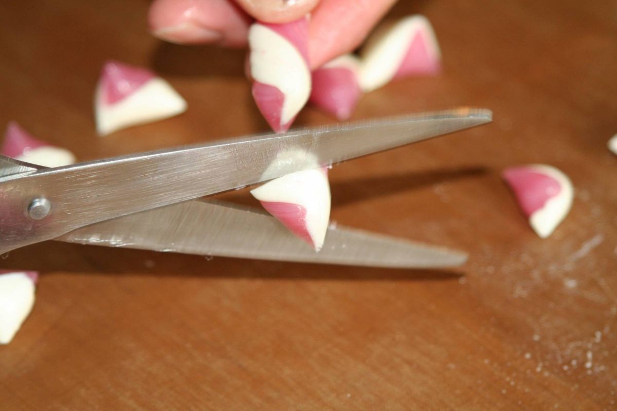 Davon jetzt ein Stück abtrennen und mit den Händen letztlich zu einem Strang kneten, von dem mit der Schere nun wunderbare Bonbons abgeschnitten werden können.