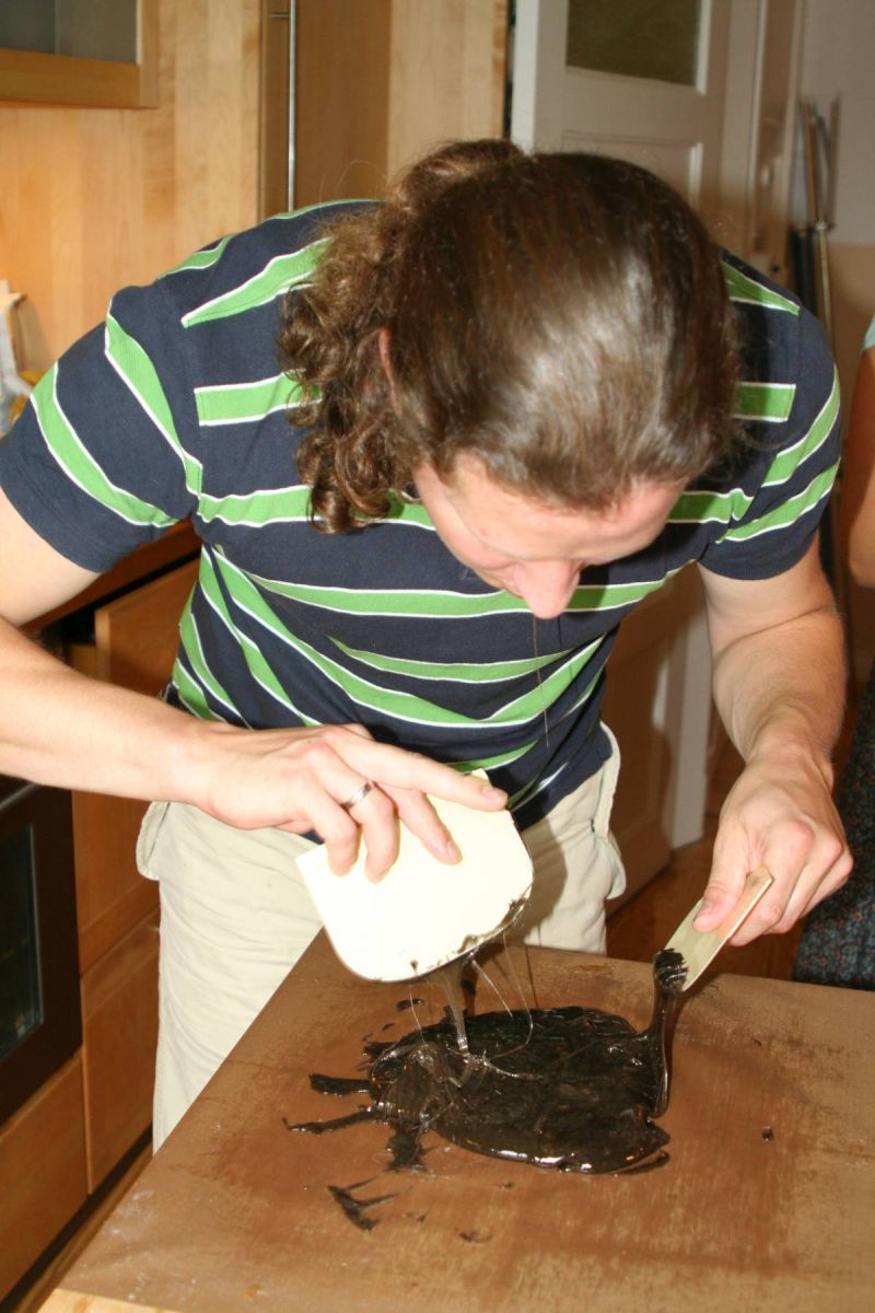 Der fertige heiße Sirup (162°C!) wird auf die geölte Teflonunterlage gegeben und mittels fein dosierten Geschmackszugaben aromatisiert und eingefärbt – dazu mit den Schabern gewendet und geknetet, bis langsam eine festere, immer noch heiße Masse entsteht.