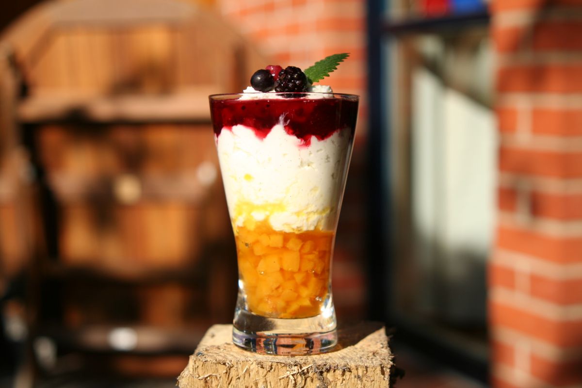 Das Dessert in schöne Gläser schichten: Zuerst zwei Esslöffel Quitten, darauf zwei Esslöffel Topfencreme, darauf zwei Esslöffel Beerenragout und zum Abschluss wieder zwei Esslöffel Topfencreme. Mit Beeren und Melisseblättchen garnieren.