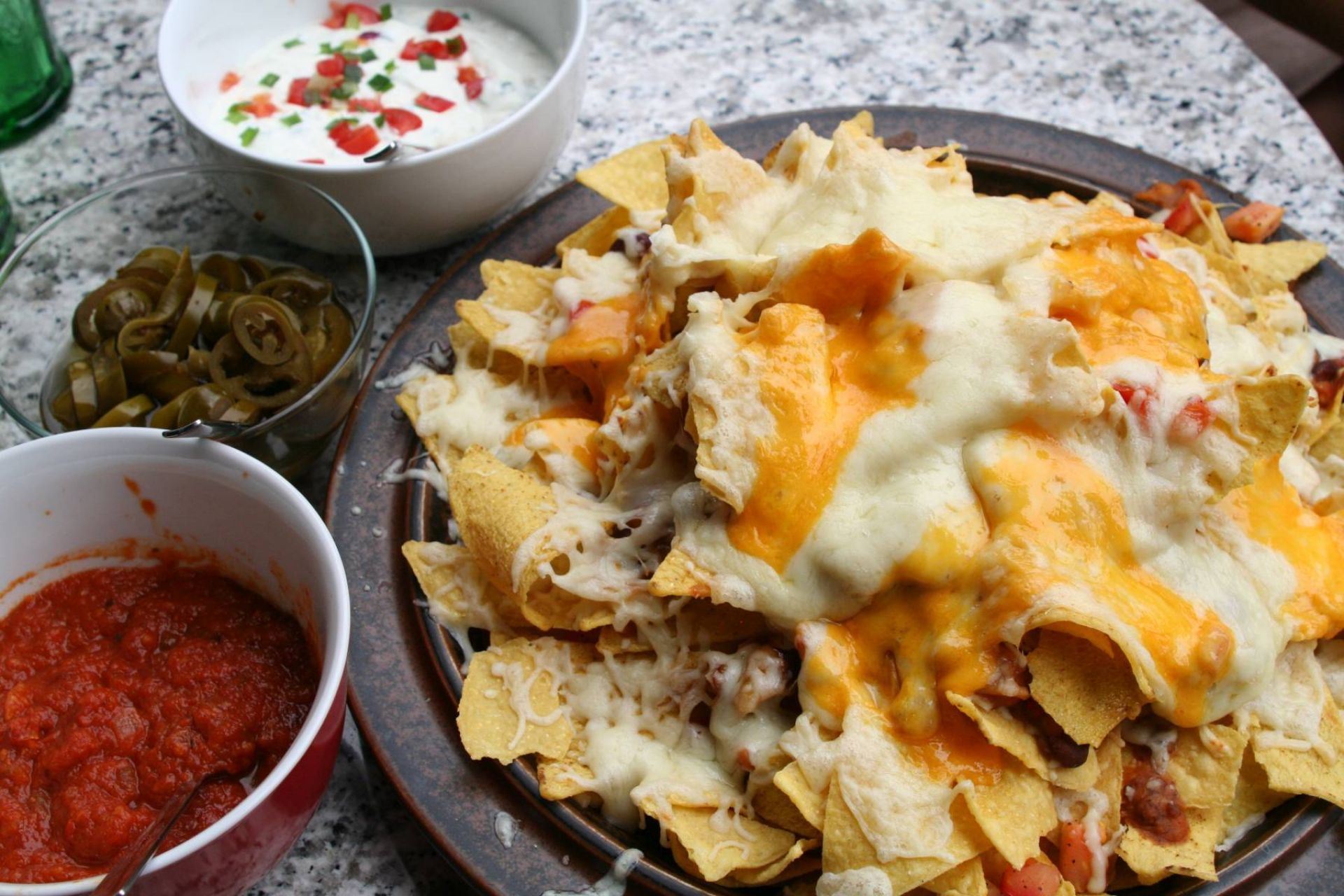 Mindestens zwei Tüten mexikanische Nachos in Schichten auf eine große Servierplatte häufen. Dazwischen frische Tomaten-stücke mit Zwiebeln anrichten, vielleicht gewürfelte Avocado, einige Jalapeños und dann ein geniales warmes Bohnenmus dazwischen löffeln. Zum Schluss den Berg mit geriebenem Käse bestreuen und als zweite Farbe gelbgoldenen Cheddar dazu verteilen. Ab in den Backofen und den Käse kurz schmelzen lassen.