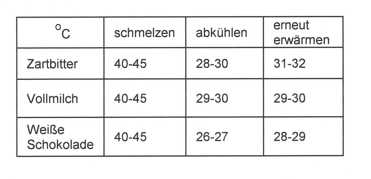 Die Schokolade dankt es Einem, wenn man anständig mit ihr umgeht! Temperaturen unbedingt einhalten! Bloß kein Wasser in die Schokolade schwappen lassen!