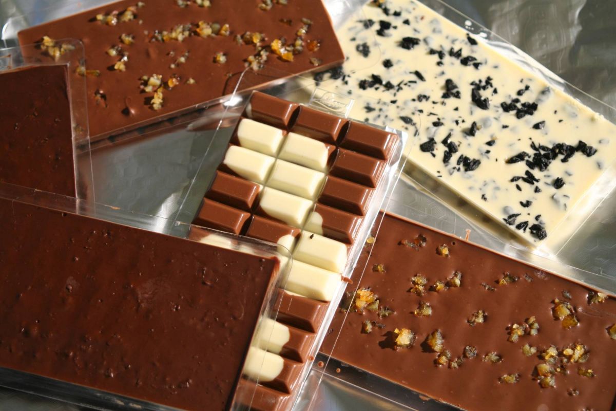Wir haben uns für Kuhfleckenschokolade für Maje entschieden, Vollmilch-Orangenschokolade, Zartbitter-Ingwer und weiße Schokolade mit Oliven.