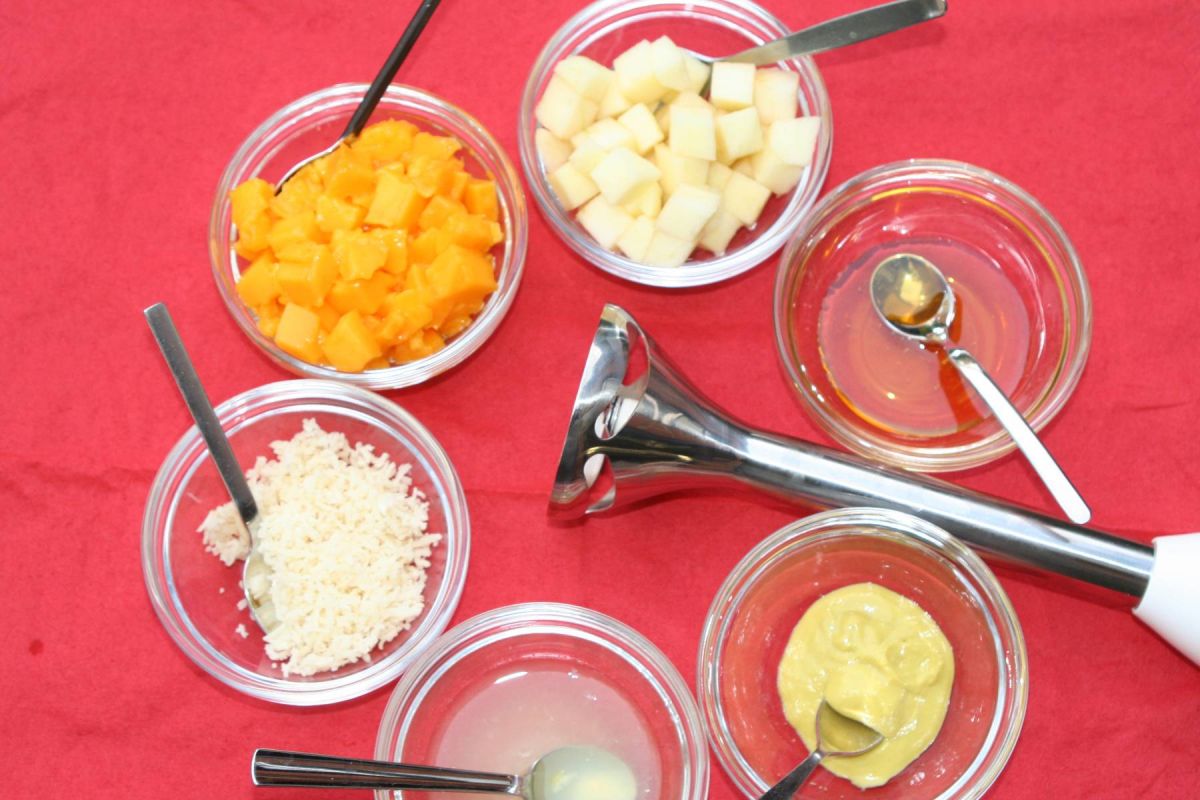 Mango und Apfel schälen und klein Würfeln, restliche Zutaten dazu und alles mit dem Zaubermaxl pürieren. Fertig!