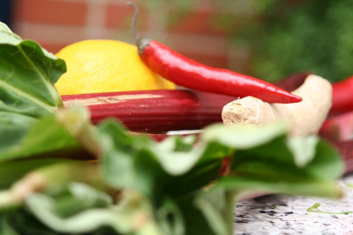 Rhabarber schälen und in 2cm lange Stücke schneiden. In der Pfanne die Zwiebeln, Chili, Ingwer, Knoblauch in Olivenöl kurz anschwitzen. Den Rhabarber dazugeben. Wenn er nach etwa 10 Minuten etwas Flüssigkeit abgegeben hat, fügt man den Zucker hinzu und schmeckt mit Essig ab. Das Ganze bei kleiner Hitze noch etwa 20 Minuten weiterköcheln lassen, bis das Chutney eine kompottartige Konsistenz hat. Heiß in die vorbereiteten Gläser zum Aufbewahren und erst in 3 Jahren im Keller wiederfinden und dann wegschmeißen oder doch lieber gleich zu Lamm, kräftigem Fisch oder gebackenem Ziegenkäse essen.