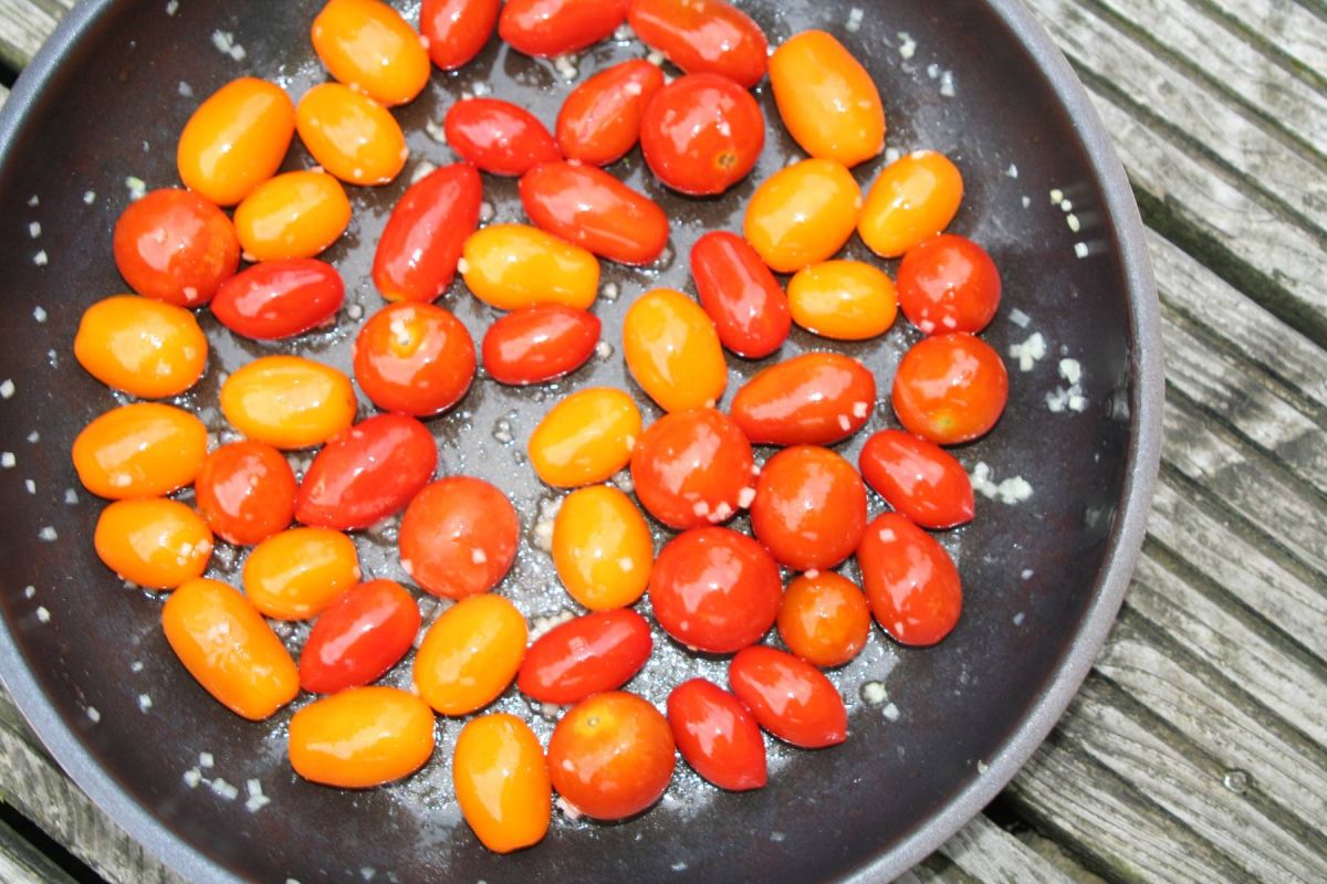 Dazu (in reichlich gepresstem Knoblauch geschwenkte) Mini-Roma-Tomaten und dann der Lachs!