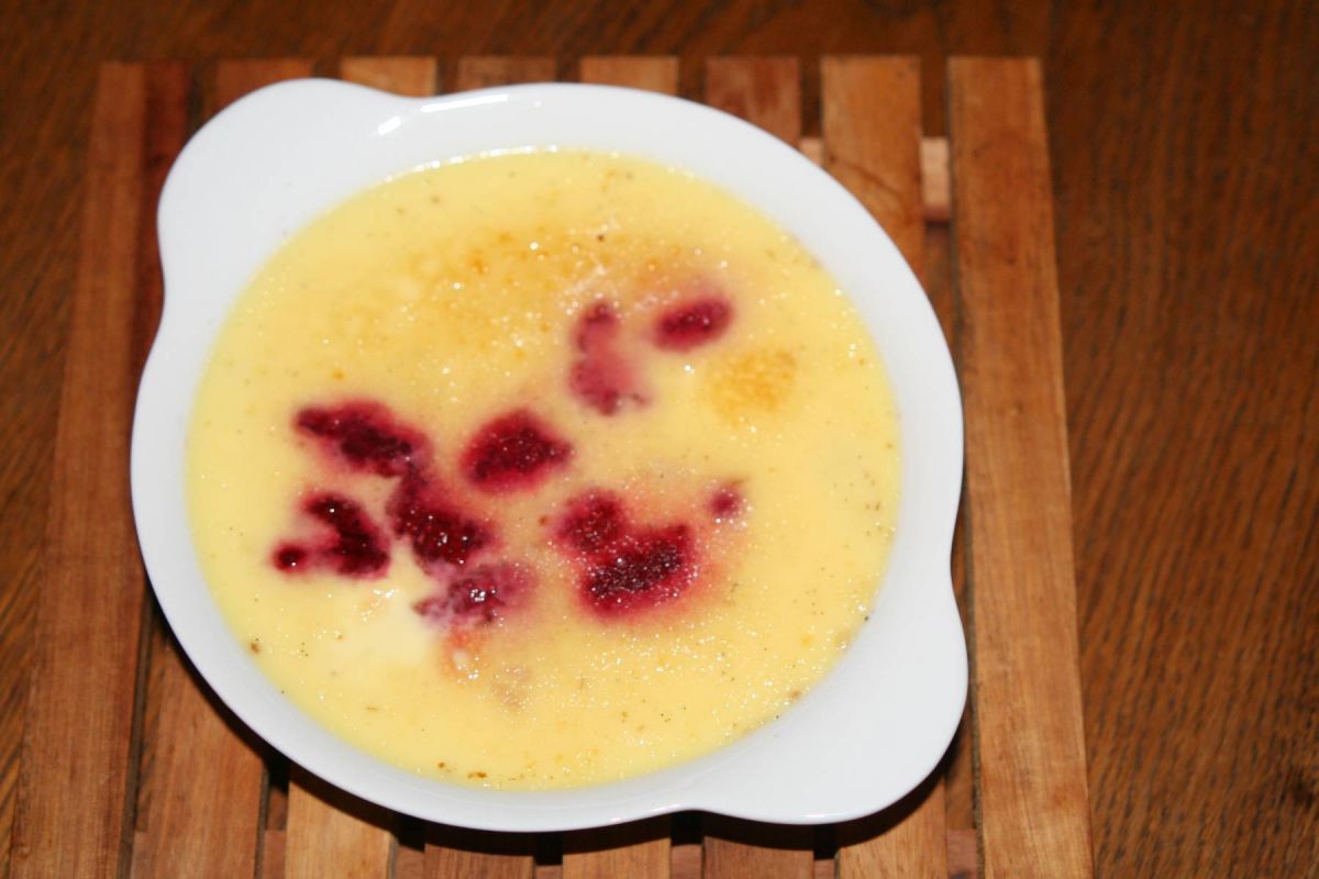 Zum Nachtisch: Crème brûlée auf geeisten Himbeeren.