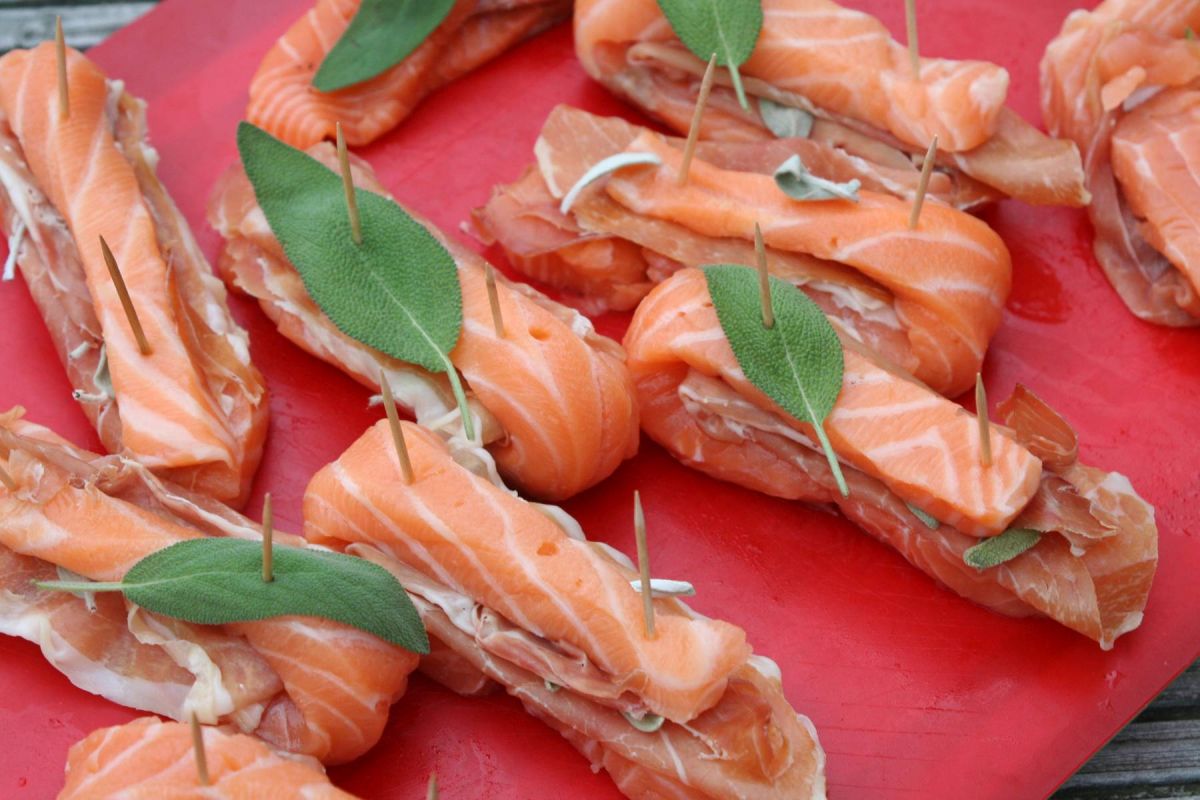 Die Lachsschnitten mit dem aufgedrehten Schinken belegen, klappen und mit Zahnstochern auch gleich noch ein BIO-Salbeiblatt sichern.