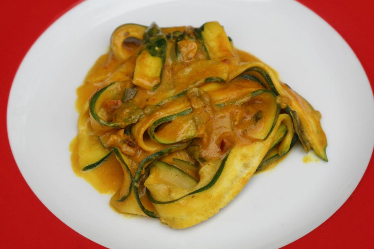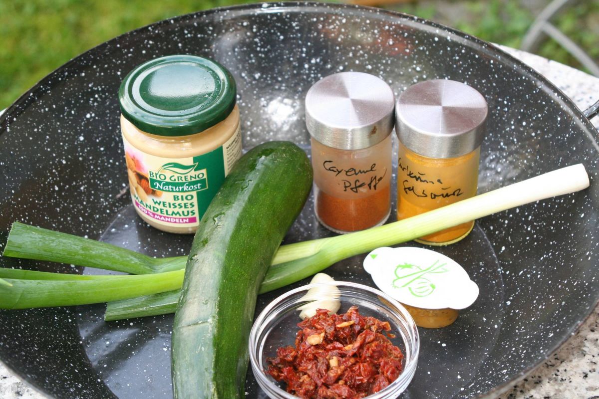 zB in einem Wok werden die klein gewürfelten Tomaten, die Frühlingszwiebeln und der Knoblauch angebraten, kräftig mit Kurkuma gewürzt und mit Cayennepfeffer abgeschmeckt. Anschließend 1 Tasse Gemüsebrühe oder Fond, in der 3 EL vom Mandelmus gelöst sind, angießen und die Zucchinistreifen kurz mit anschwitzen. Schon fertig und reicht für mindestens 4 vegane Hungerhaken.