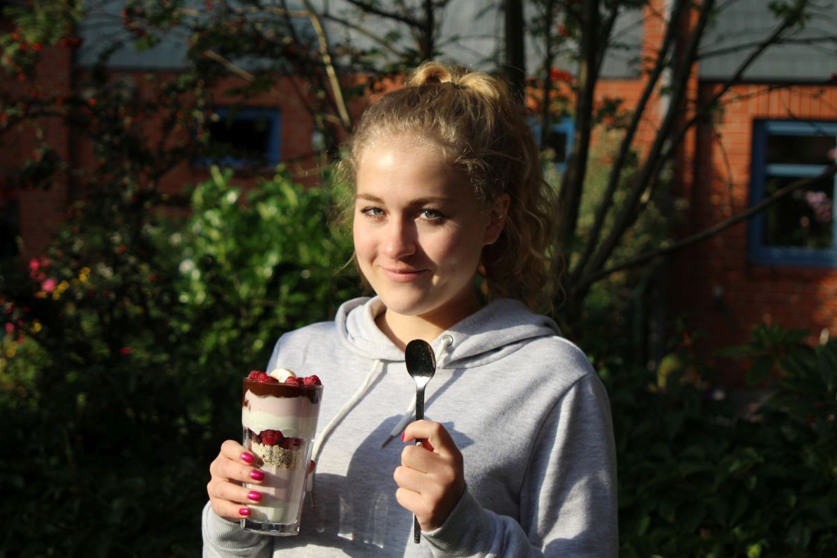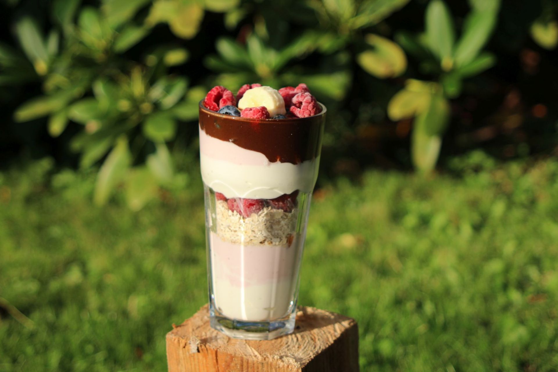 Bezeichnend ist die Wahl des Glases. Es ist das hohe voluminöse Cocktailglas, das hier zunächst mit einem 0,3%igem Magerquark gefüllt wird, der mit etwas fettreduzierter 0,5%iger Magermilch glattgerührt ist. Jetzt kommen in Schichten zarte Haferflocken, ungeschälte Mandeln („nur ganz besondere gesunde Fette“), Tiefkühl- Himbeeren und Brombeeren, Kirsch-Banane Quark 0,2% und frische Blaubeeren der Saison dazu.