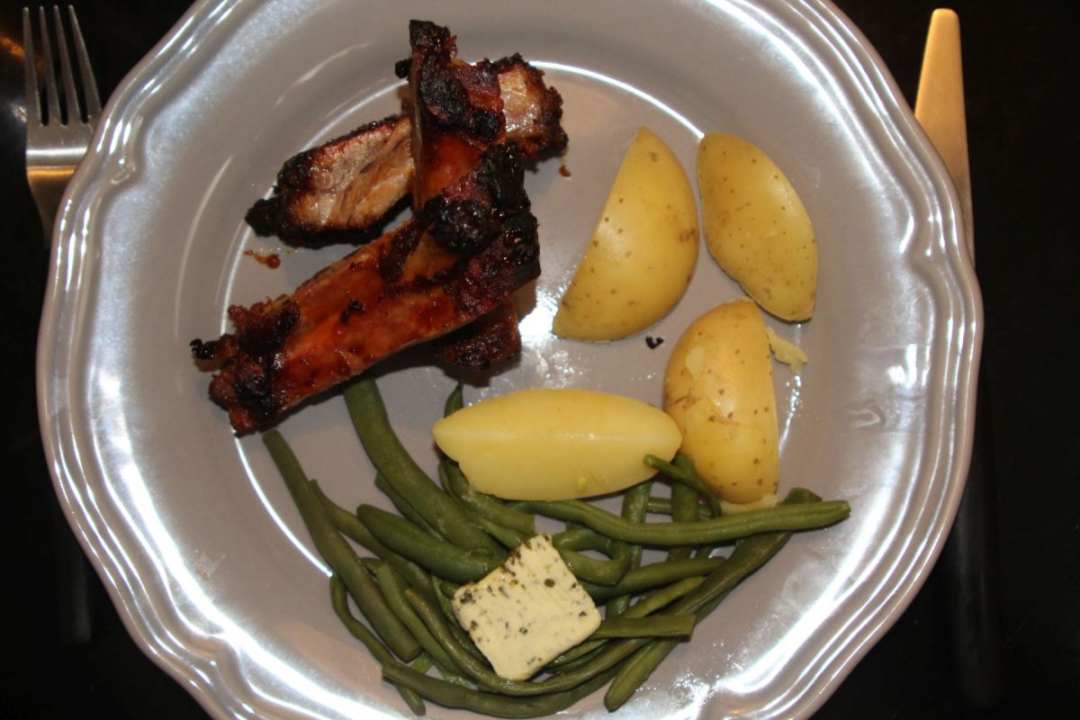 Serviert wurden die bereits aufgeschnittenen Rippchen, dazu Buschbohnen und neue Kartoffeln aus dem eigenen Hochbeet! Ein einziger Hochgenuss!