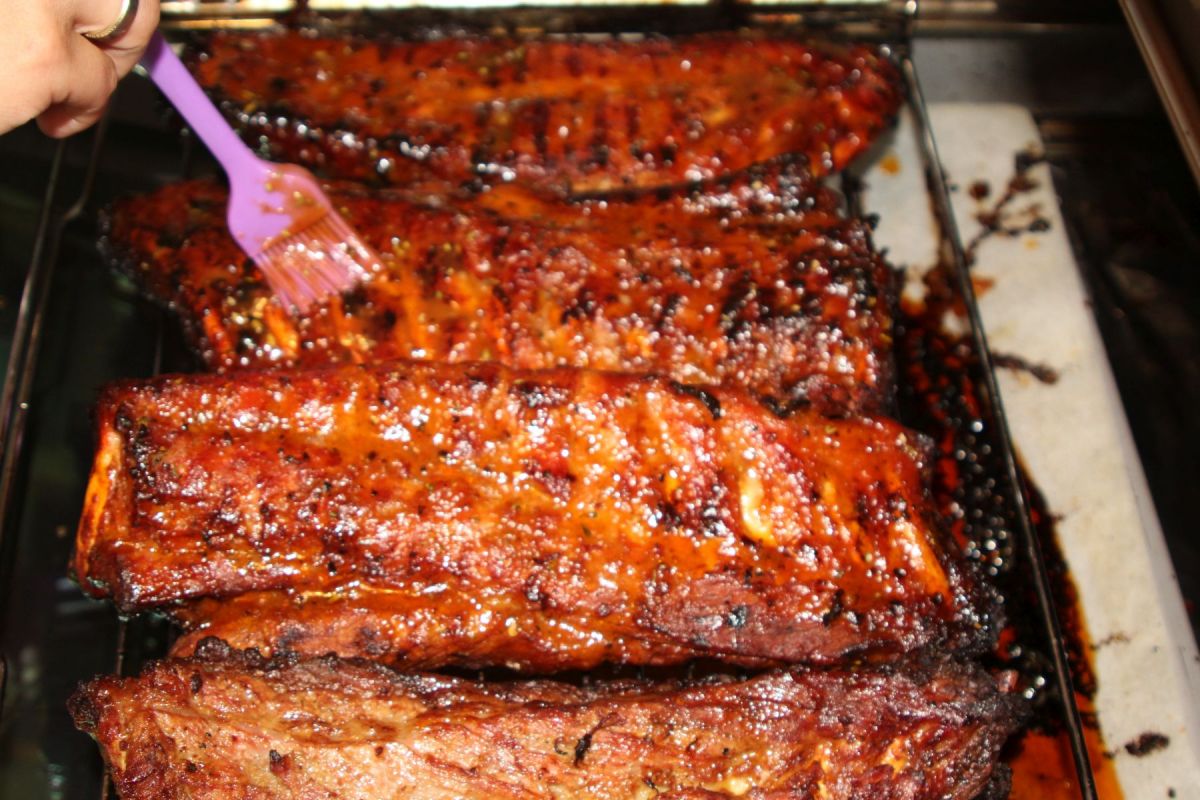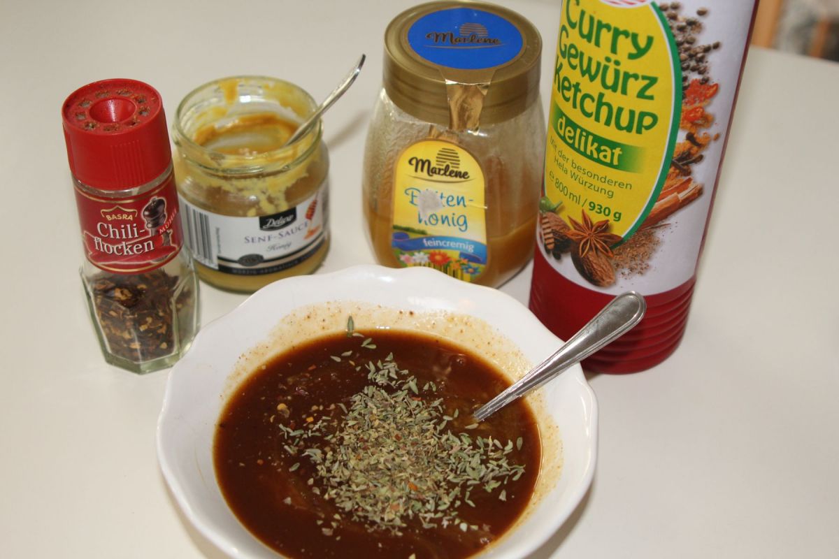 Gegen Ende der Garzeit (erst im Grill für das Foto – dann, wie gewohnt im Backofen) kommt Hannas geheime Marinade zum Einsatz. Angerührt aus verschiedenen schwierigen Essenzen wird das Fleisch noch mehrfach bepinselt.