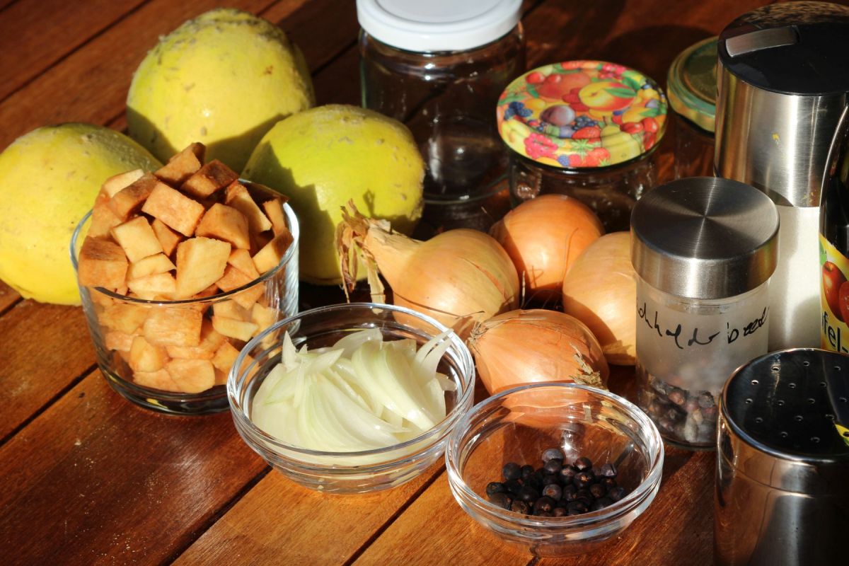 Auch hier werden die Quitten geschält, dann wird das Gehäuse entfernt und das Fruchtfleisch in 1 cm große Würfel geschnitten. Diese dann mit den anderen Zutaten in einen Topf geben, die Flüssigkeit aufkochen lassen, alles bei mittlerer Hitze 1,5 bis 2 Stunden lang köcheln lassen.