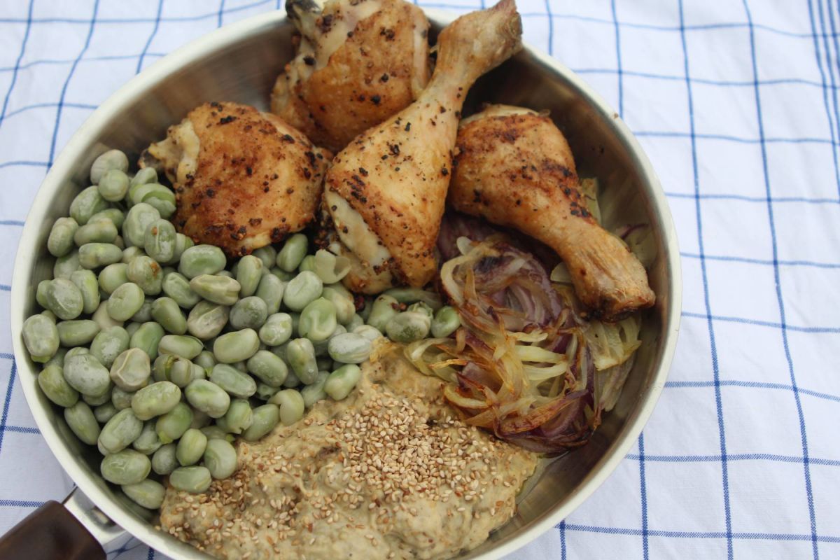 Hauptgericht: Huhn an dicken Bohnen und Auberginenmus