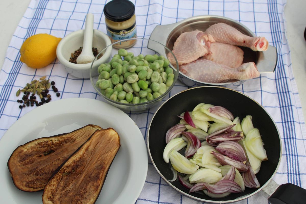 - Etwas Auberginenmus mit Bohnen, Hühnerkeulen und Zwiebeln auf vorgewärmte Teller geben, mit Sesam und Sumach bestreuen, mit Zitronenspalten garniert servieren.