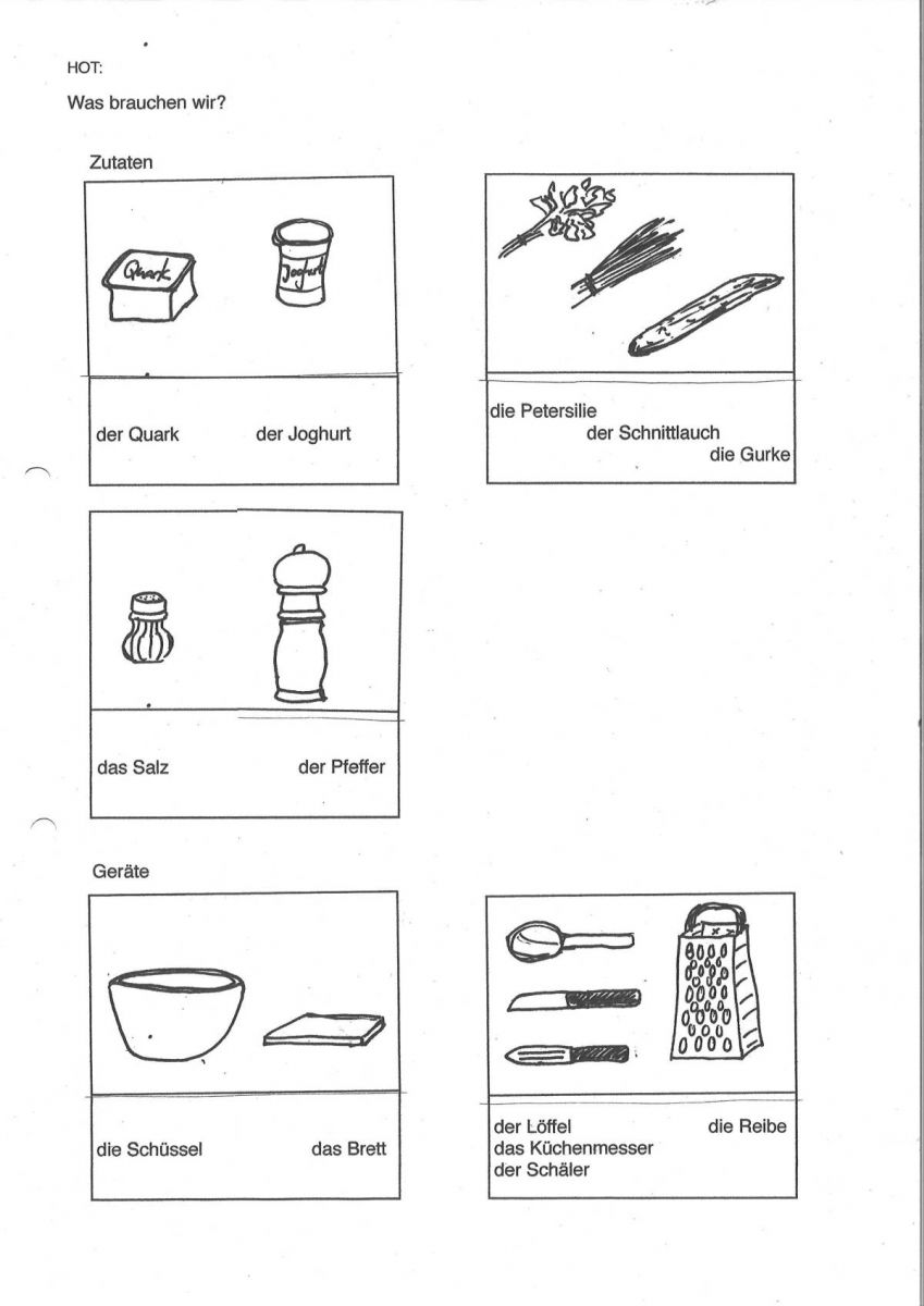 Alles wird mit Namen benannt. Einige Dinge sind allen bekannt (Joghurt), Quark nicht, der eine stolpert über das Wort Gurke – die chorische Übung hilft darüber hinweg.