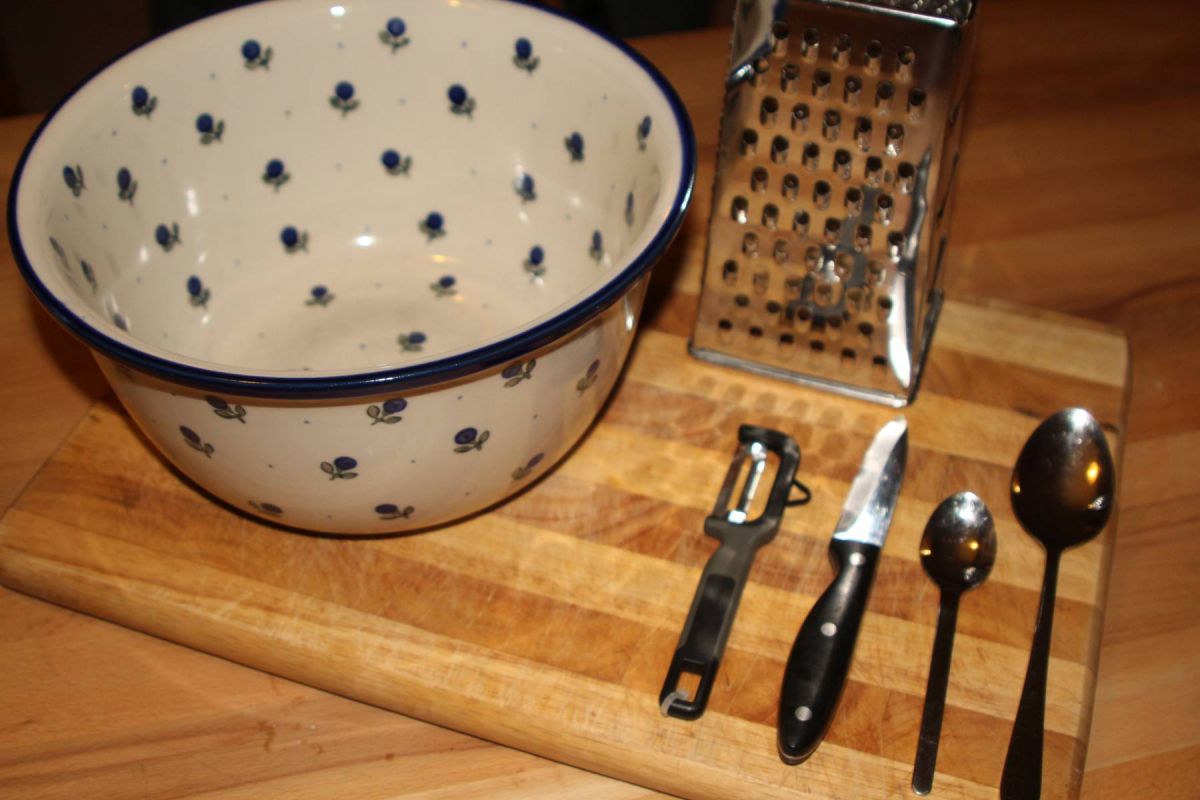 Schüssel, Messer, Brett, Löffel, Reibe, Schäler – ein kleiner fremdartiger Einblick in die deutschen Gerätschaften.
