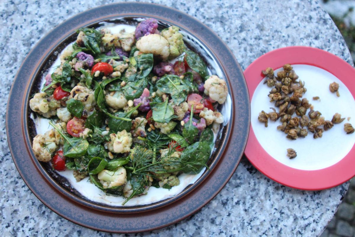 Die Kapern abtropfen lassen und in einem flach mit Sonnenblumenöl gefüllten Topf 1 Minute frittieren – danach auf Küchenkrepp abtropfen lassen. Die Kapernblüten öffnen sich beim Frittieren und schmecken knusprig, leicht säuerlich und wunderbar.