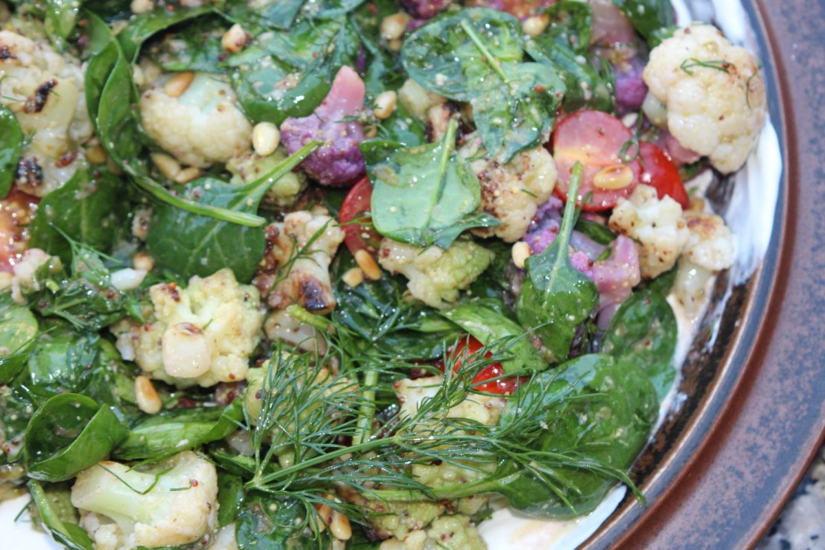 Die Blumenkohlröschen jetzt mit der Marinade, dem gehackten Dill, den halbierten Tomaten und den Spinatblättern gründlich mischen und abschmecken.