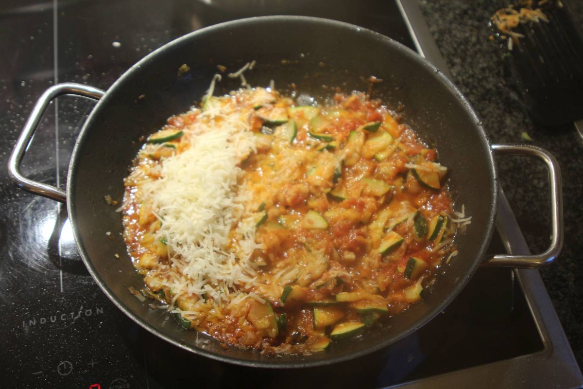 Zucchini in kleine Scheiben, geviertelt schneiden, mit Knoblauch und Zwiebeln anbraten mit einem Tomatensugo (nicht zu flüssig) aufkochen, frischen Parmesan einstreuen und mit Salz und Pfeffer abschmecken. Abkühlen lassen und mit frischen Parmesanspänen bestreuen.