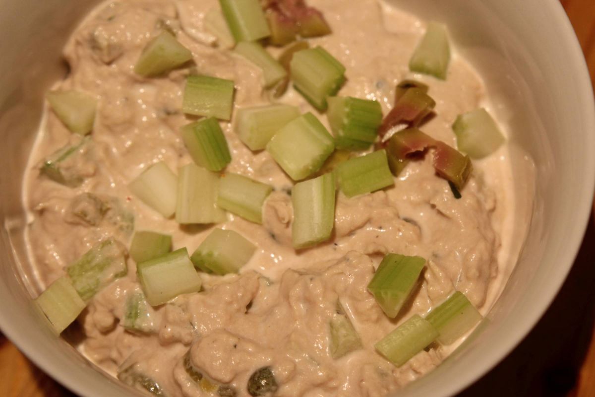 Tunfisch (aus der Dose) mit Creme fraìche pürieren, kleingeschnittenen Staudensellerie, gehackte grüne Oliven und Kapern unterheben, mit Salz und Pfeffer abschmecken.