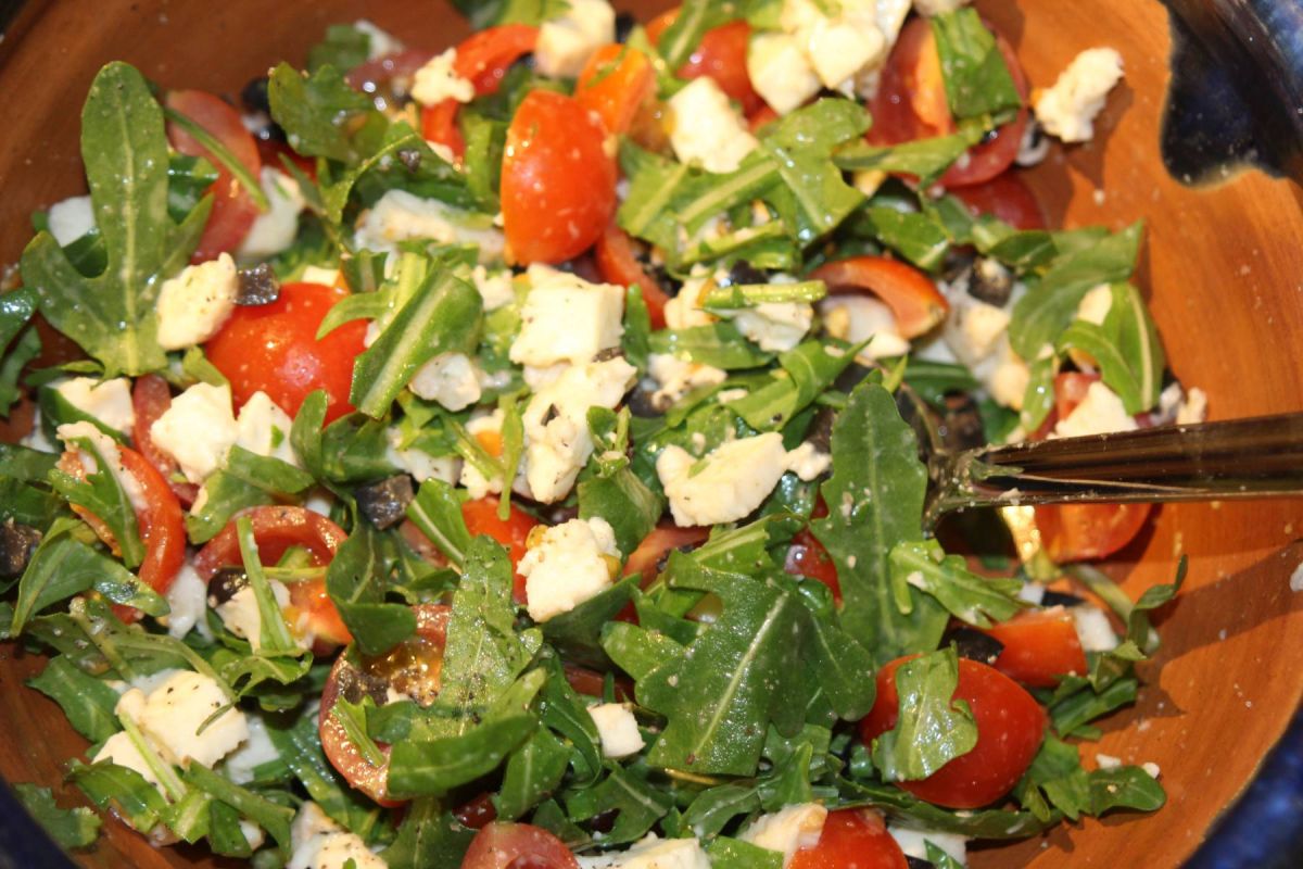 Mozzarella und Tomaten klein schneiden, Rucola kleinschneiden, schwarze Oliven klein schneiden, alles vermengen mit Balsamico und Öl, Salz und Pfeffer abschmecken.