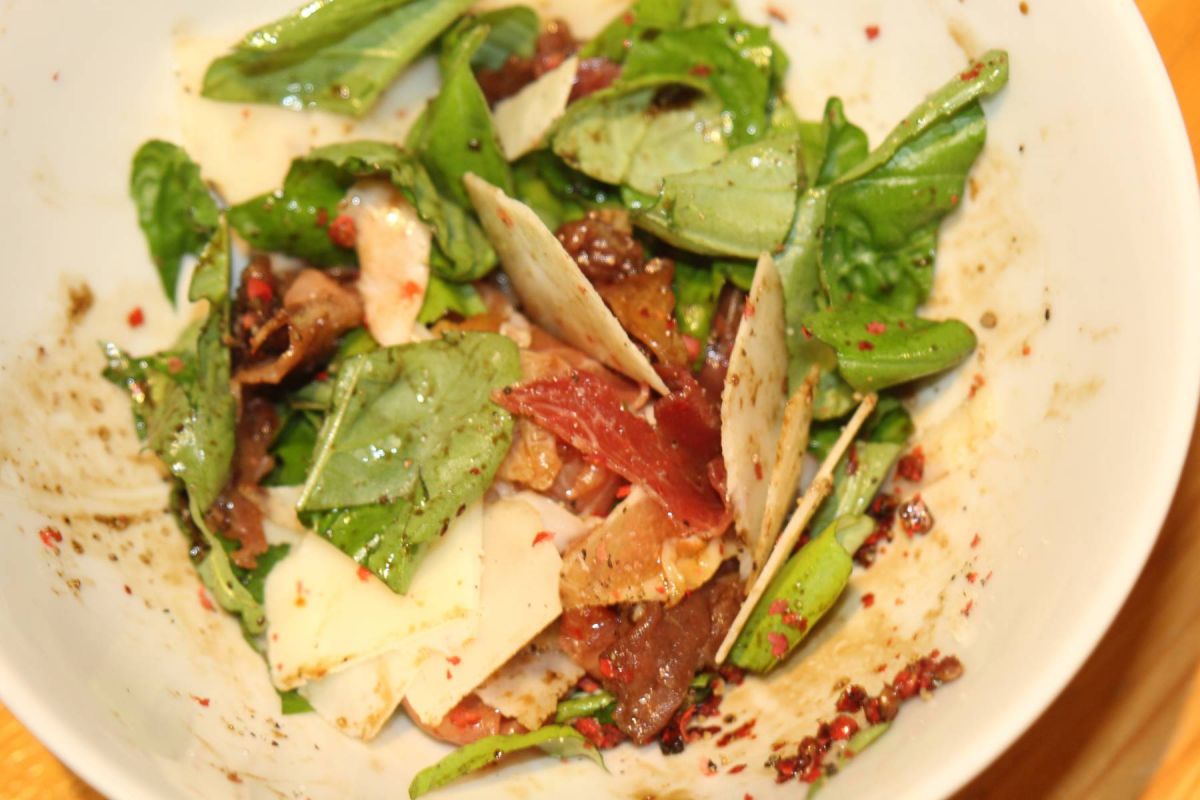 Schinken dann mischen mit gehobelten Parmesanspänen, frischem Basilikum, roten gemörserten Beeren („roter Pfeffer“), Salz und Pfeffer.