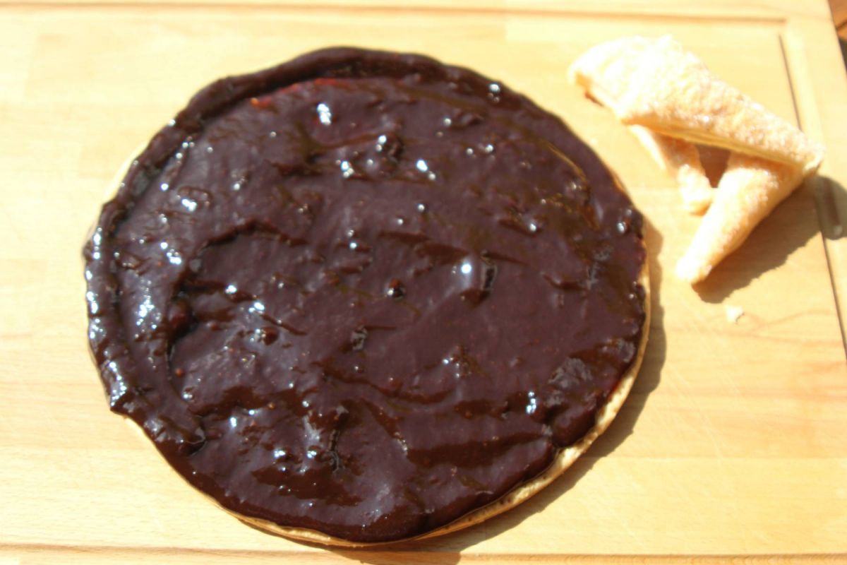 Ein Glas stückiges Pflaumenmus auf den Boden streichen.