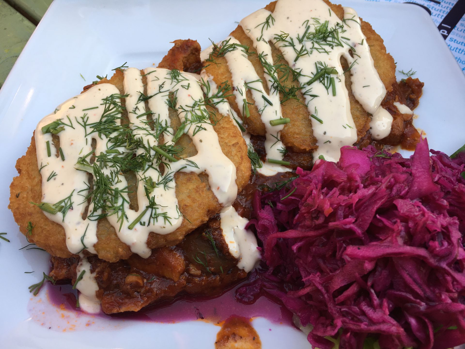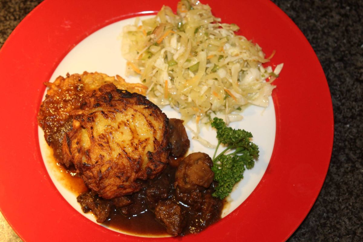 Serviert wurden kleine ausgebackene Kartoffelpuffer, gefüllt mit einem würzigen Zwiebel-Schweine-Gulasch und einem milden Sahnedressing an Dill. Als Beilage gab es Rotkohl.