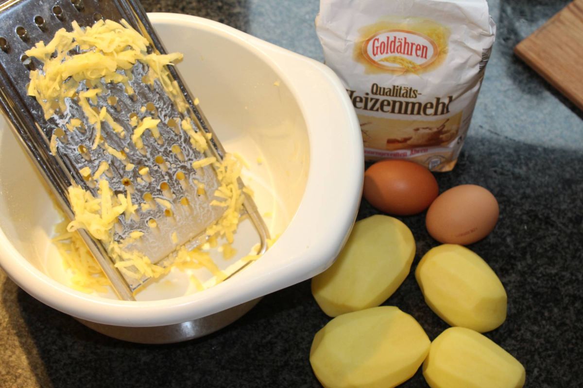 Kartoffeln und Zwiebeln natürlich schälen, dann mit einer Reibe fein oder auch gröber reiben.