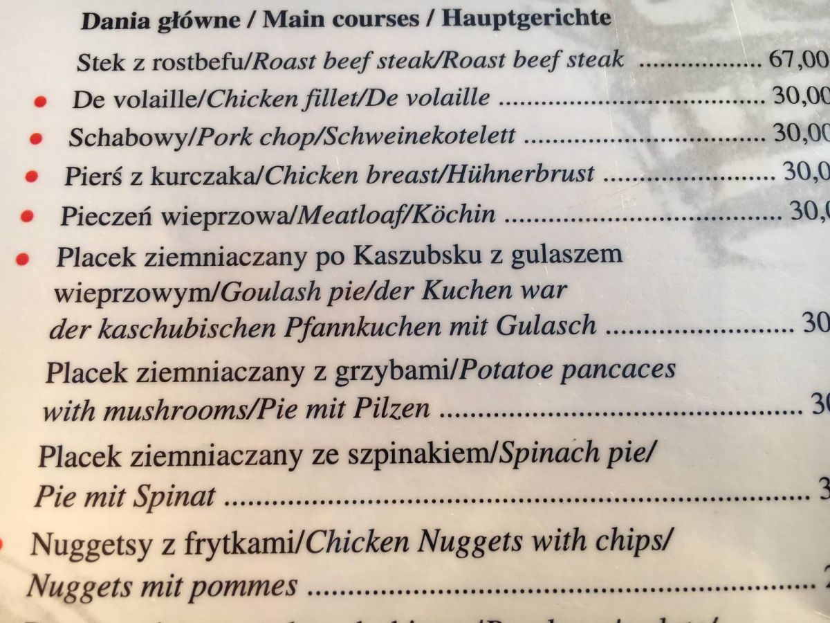 Meistens war die Speisekarte in Polen nicht so international und mehrsprachig aufgebaut wie diese – war auch nicht nötig, weil sie in der Regel klein und übersichtlich gehalten war und die TranslaterApp schnell die unterschiedlichen Fische identifizierte. Oder es gab Piroggen.