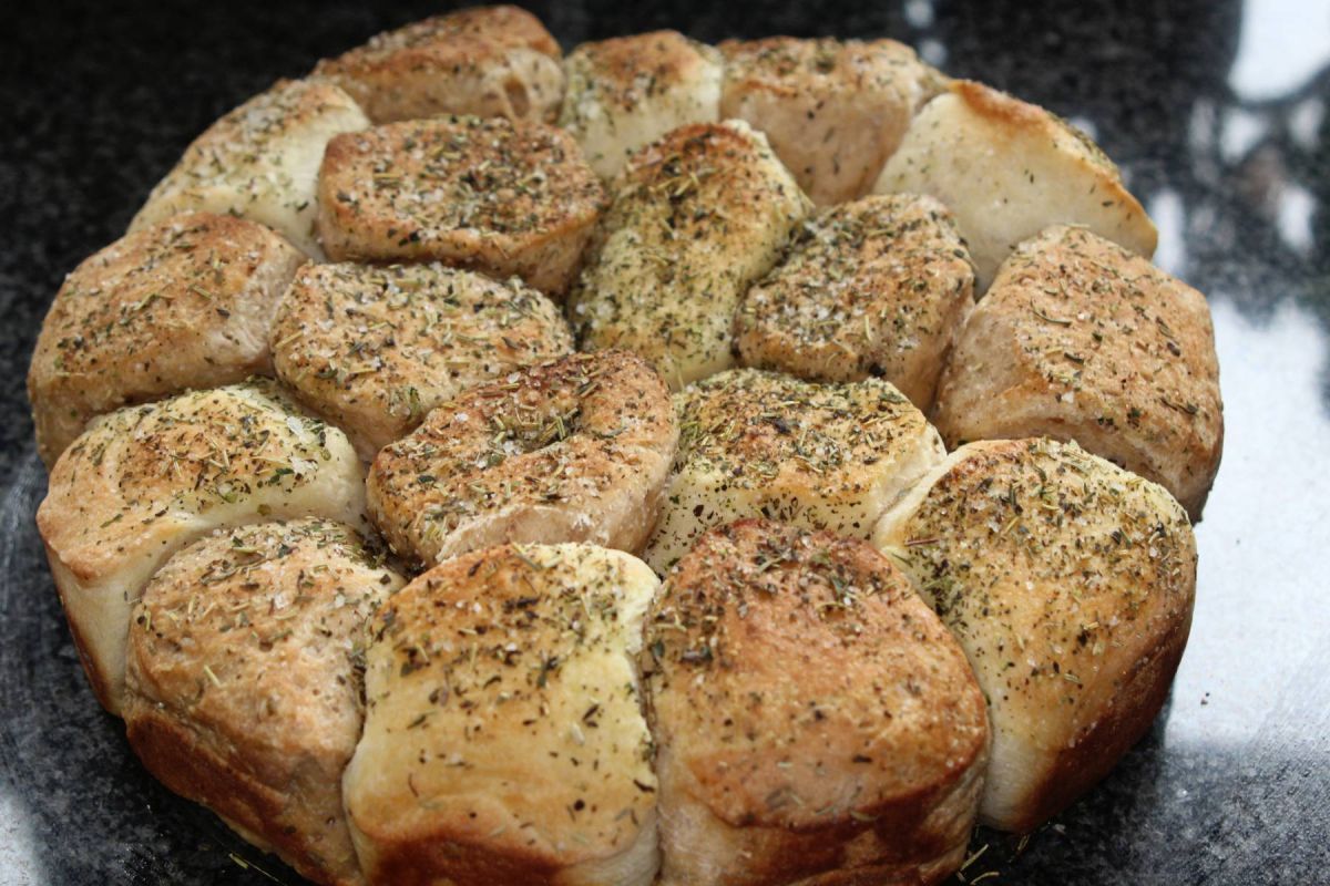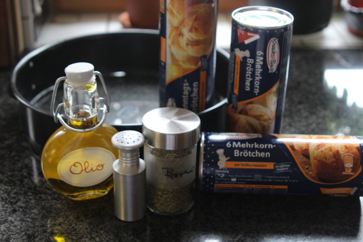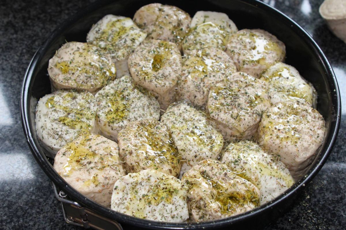 Sam füllt eine runde Backform mit den Brötchen dicht an dicht. Jetzt eine italienische Kräutermischung aufstreuen, grobes Salz dazu und mit Olivenöl großzügig beträufeln. Nach Vorschrift in den Backofen und 5 Minuten zugeben – fertig ist die Partysonne und viel Zeit für den Smoker!