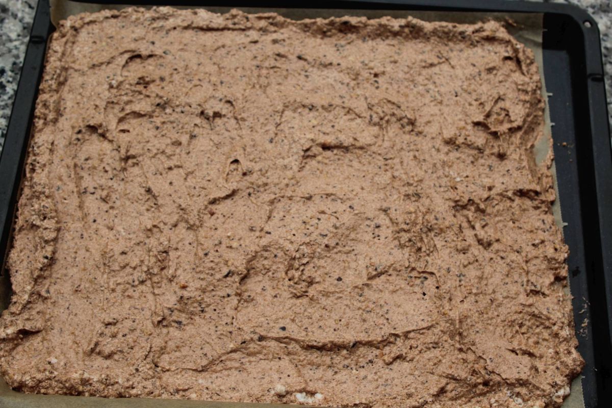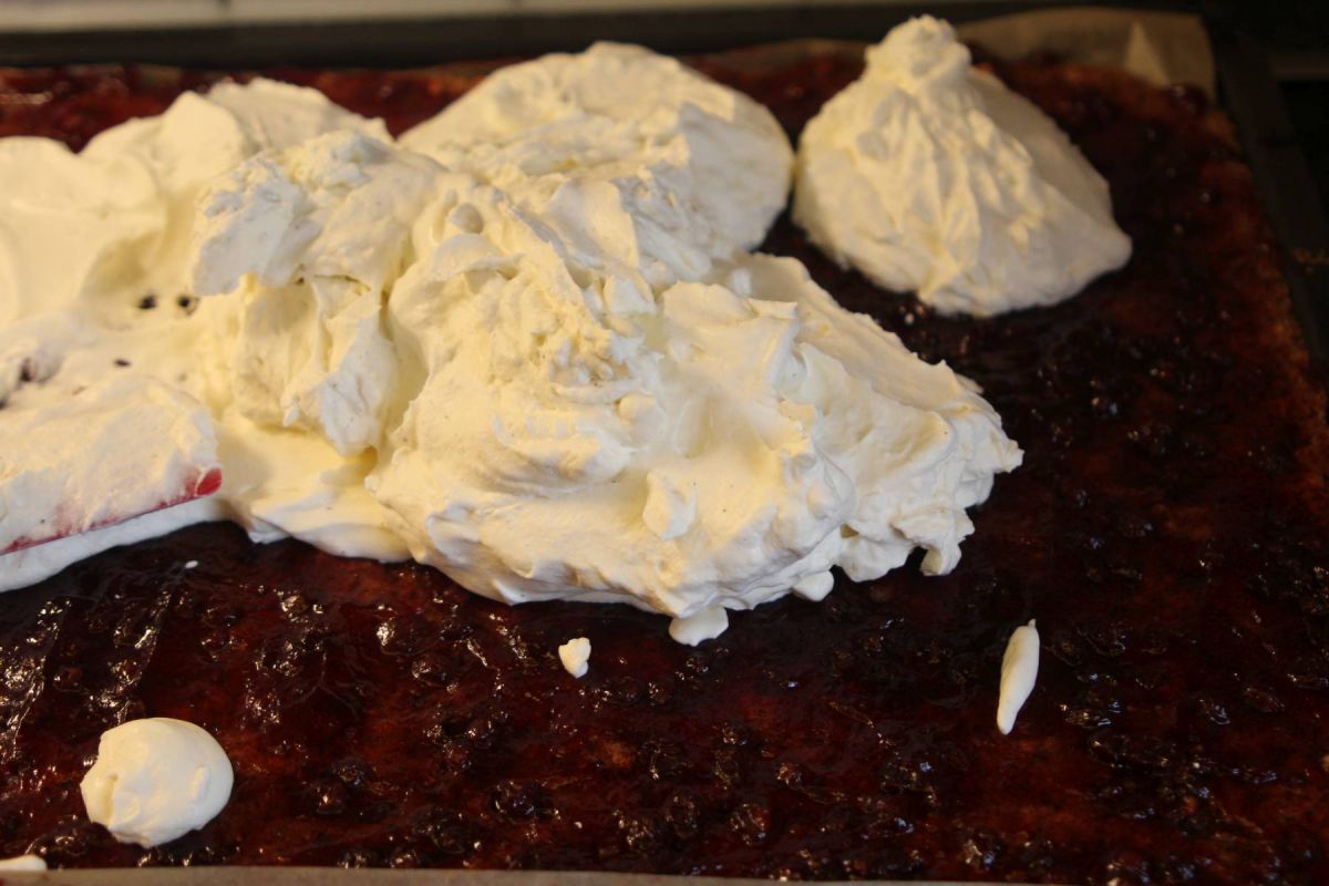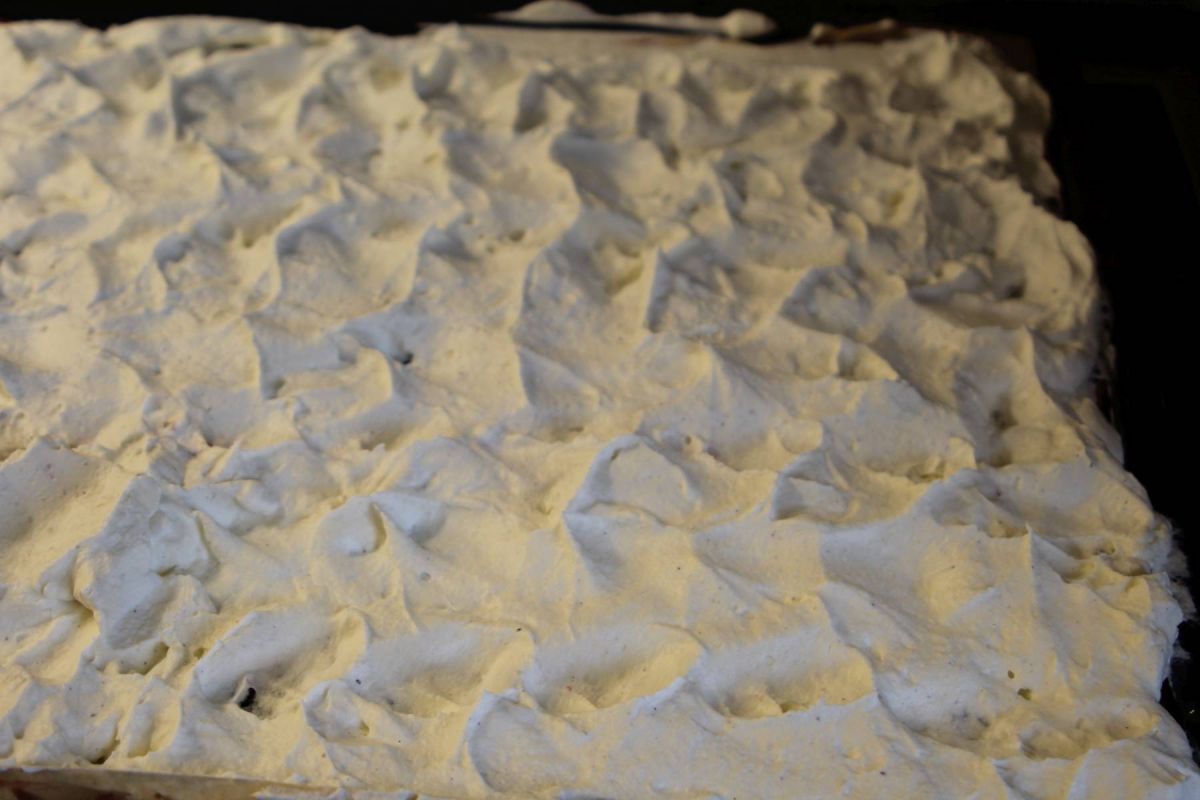 Eiweiß steif schlagen, unterheben. Teig auf ein gefettetes Backblech (30x40cm) streichen, in den Backofen schieben und bei vorgeheizten 180°C Ober-/Unterhitze (160° Heißluft) für etwa 30 Minuten backen.