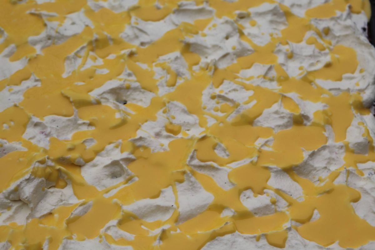 Sahne mit Vanillezucker und Sahnesteif steif schlagen. Sahne auf den Kuchen streichen und mit einem Teelöffel Spitzen ziehen. Eierlikör mit Vanillepuddingpulver kurz verrühren und diagonal über den Kuchen sprenkeln.