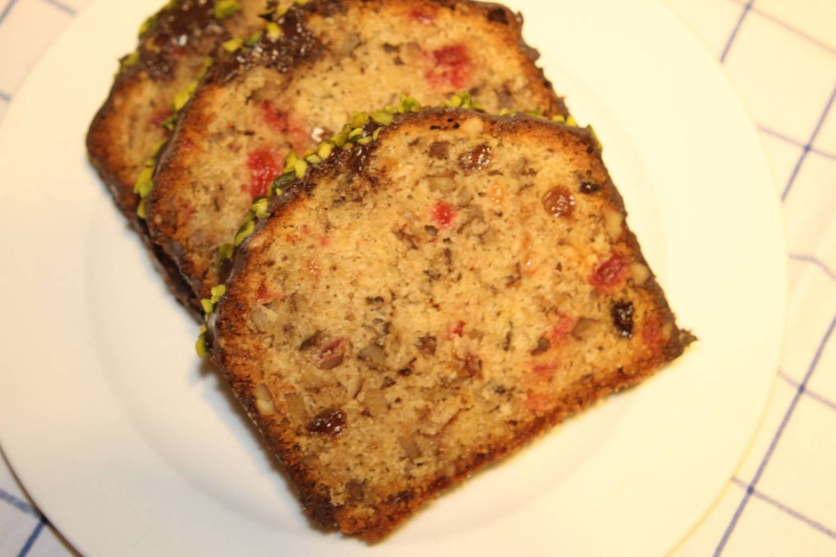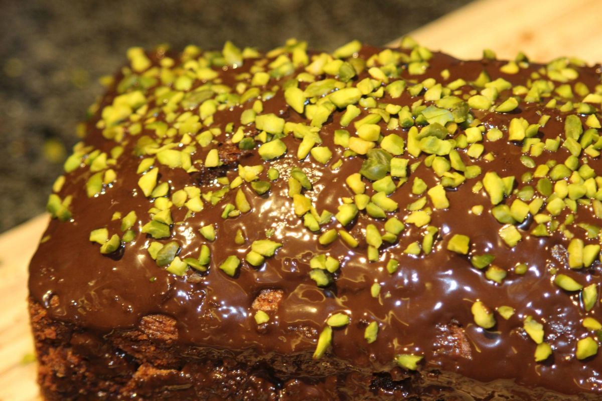 Den Kuchen in der Form abkühlen lassen, dann auf ein Kuchengitter stürzen. Die Schokoladenglasur im Wasserbad schmelzen lassen, den Kuchen damit überziehen und mit Pistazien bestreuen.