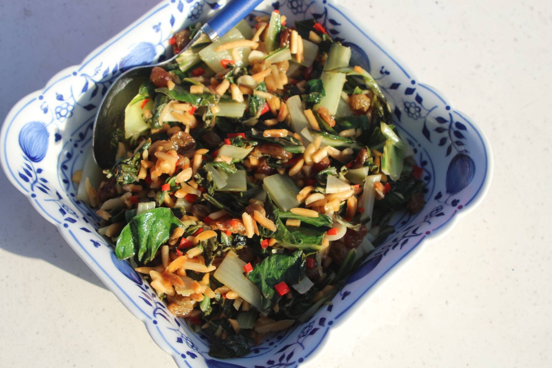 Zuerst Rosinen in Wasser einweichen. Öl in der Pfanne erhitzen, Mandeln dazu, 2 Minuten unter Rühren rösten, bis sie ein bisschen Farbe annehmen. Knoblauch dazu, weiterbraten, dabei rühren (nicht braun werden lassen). Mangold dazu, nach 2 Minuten Hitze runterschalten, Chili, Salz, abgetropfte Rosinen dazu, weitere 5 Minuten lang dünsten. Zitronenschale und Zitronensaft hinzufügen. Kurz einkochen lassen. Mit Salz und Zitronensaft abschmecken.