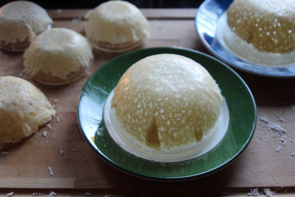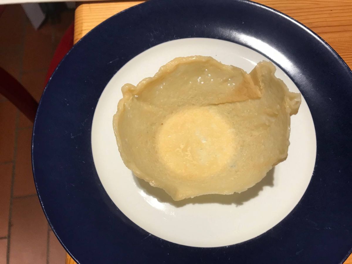 Italienischen Hartkäse reiben, gleichmäßig dünn in einer kleinen Pfanne schmelzen bis der Käse blast, vom Herd nehmen und etwas abkühlen lassen. Wenn sich der Käse in einem Stück am Rand und von der Pfanne lösen lässt, auf eine kleine Schüssel stülpen. Andrücken und weiter abkühlen lassen. Wenig Arbeit – großer Effekt.
